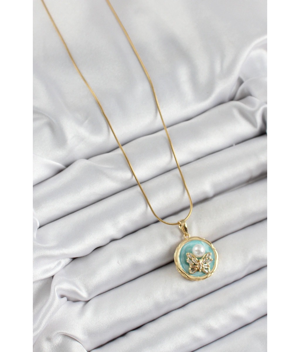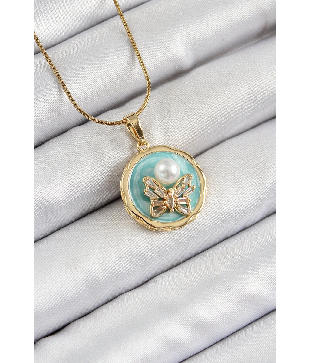 Shoecide 316l Çelik Zincir Zirkon Taşlı Turkuaz Sanatsal Portre İnci Detaylı Kelebek Model Gold Renk Kadın Kolye