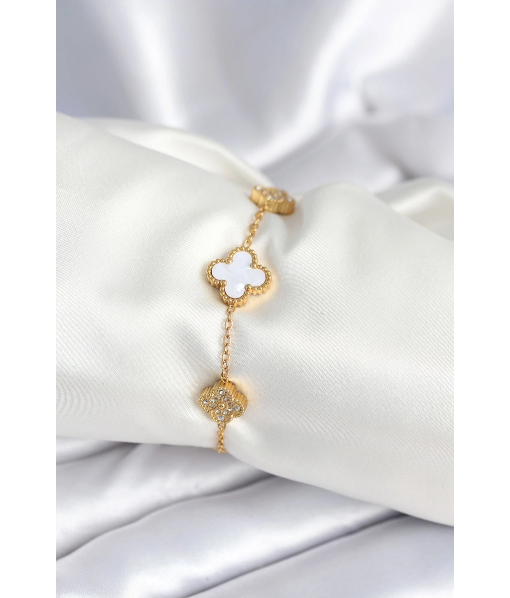 Shoecide 316l Çelik Zincir Zirkon Taşlı Yonca Beyaz Kadın Bileklik