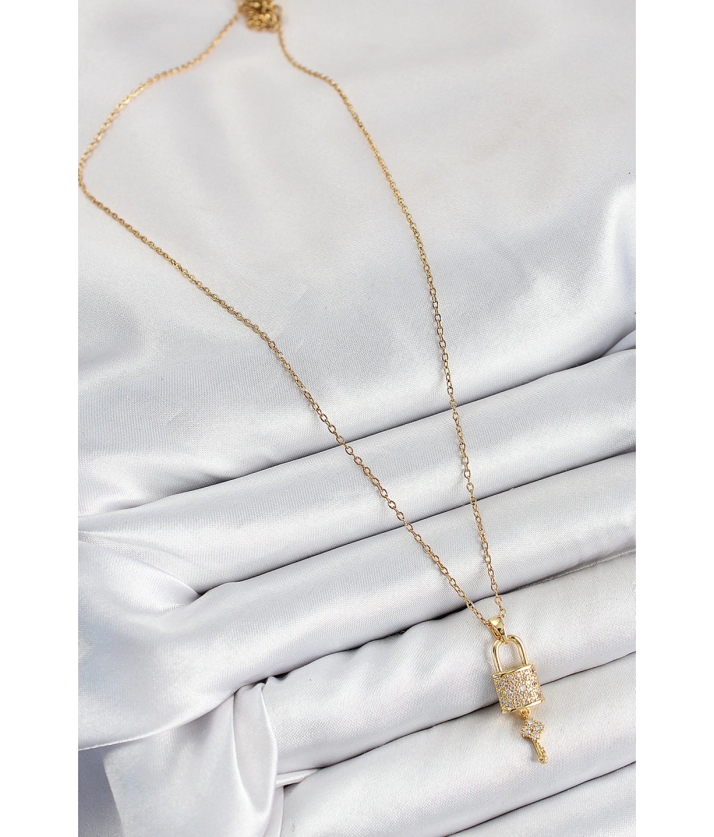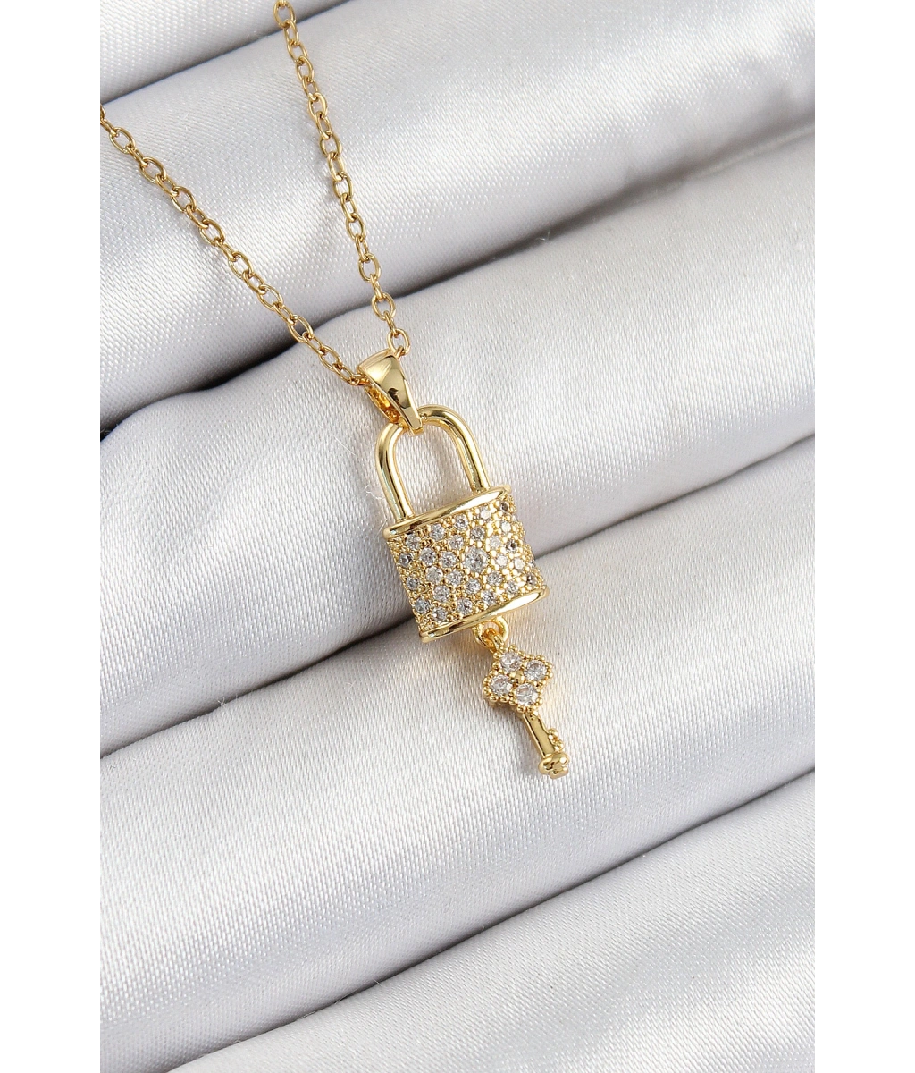 Shoecide 316l Çelik Zirkon Taşlı Kilit Ve Sallantılı Anahtar Model Gold Renk Kadın Kolye