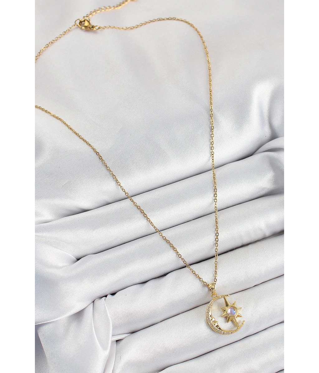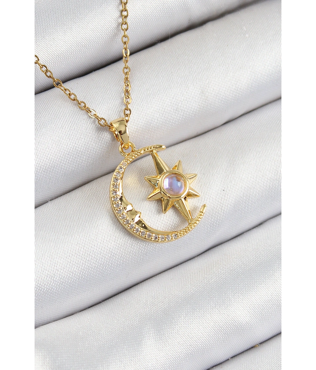 Shoecide 316l Çelik Zirkon Taşlı Kutup Yıldızlı Hilal Model Gold Renk Kadın Kolye