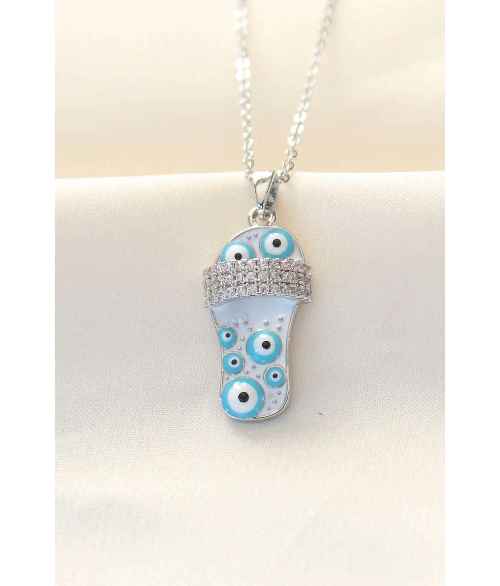 Shoecide 316l Zinciri Çelik Zirkon Taşlı Gümüş Renk Nazar Boncuklu Terlik Kolye
