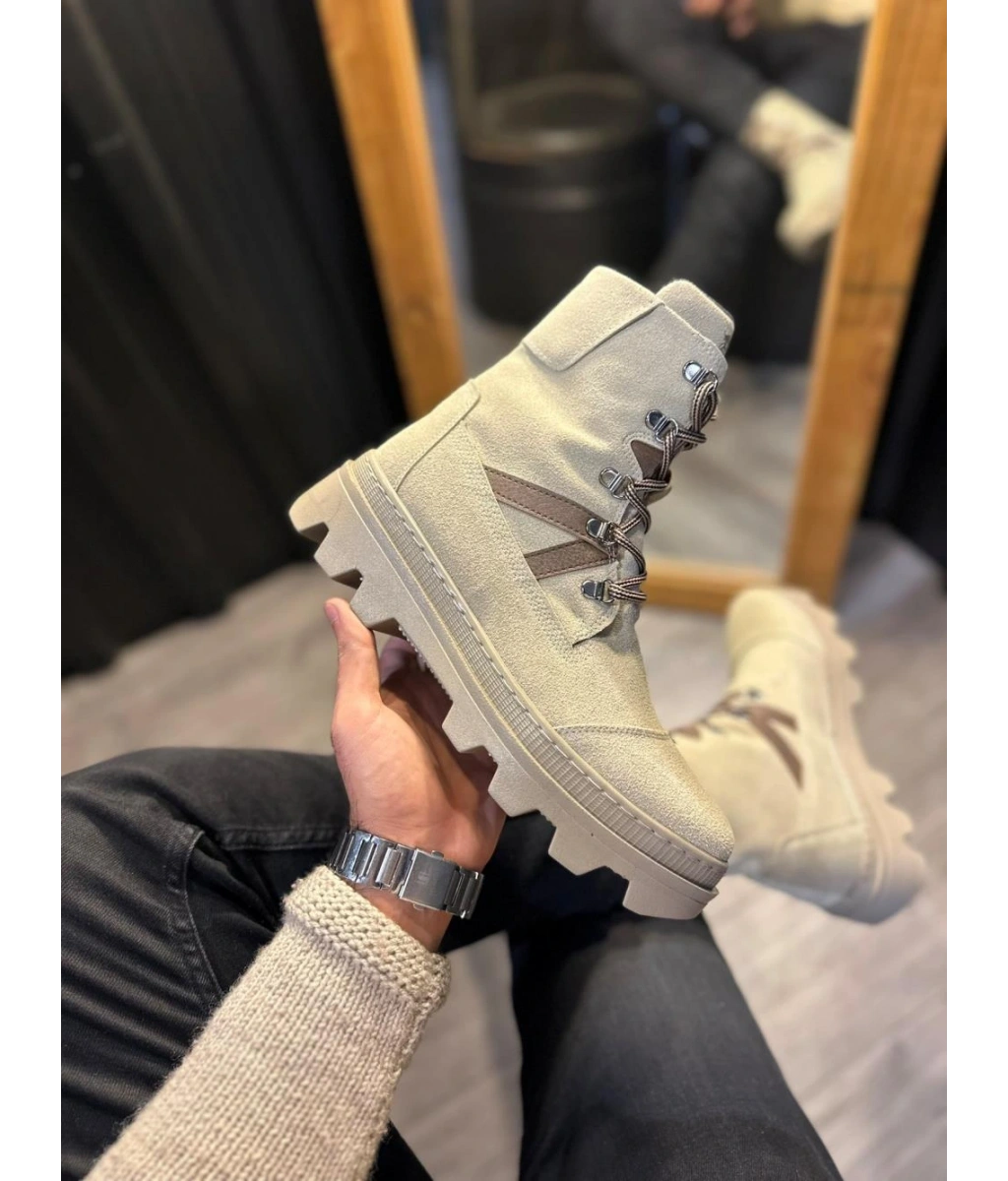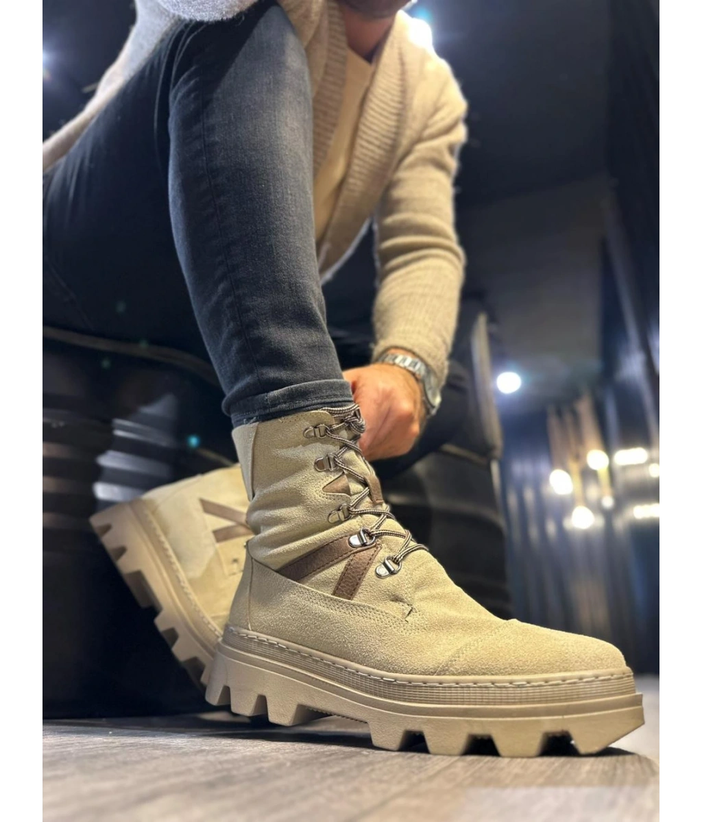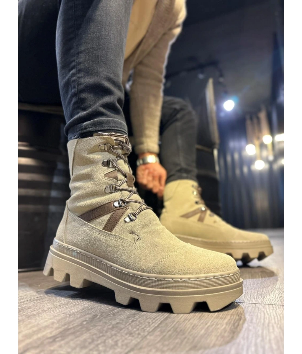 Shoecide Sb0713 Bağcıklı Süet Bej Yüksek Taban Erkek Tarz Spor Bot