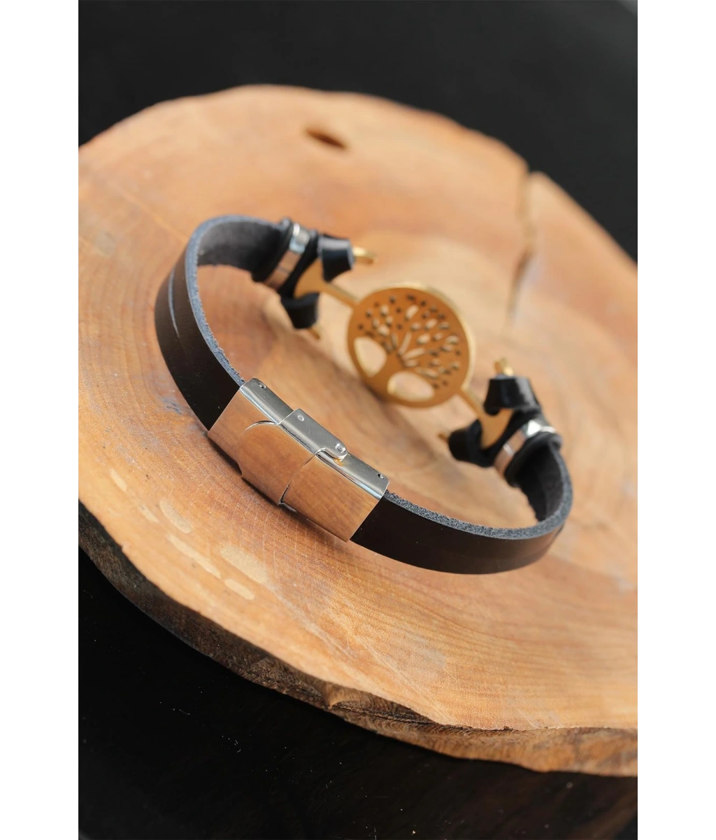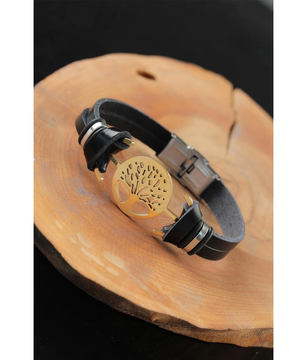 Kendinizi Gold Renk Metal Ağaçlı Tasarım Siyah Renk Deri Erkek Bileklik ile her zaman şık göreceksiniz.
