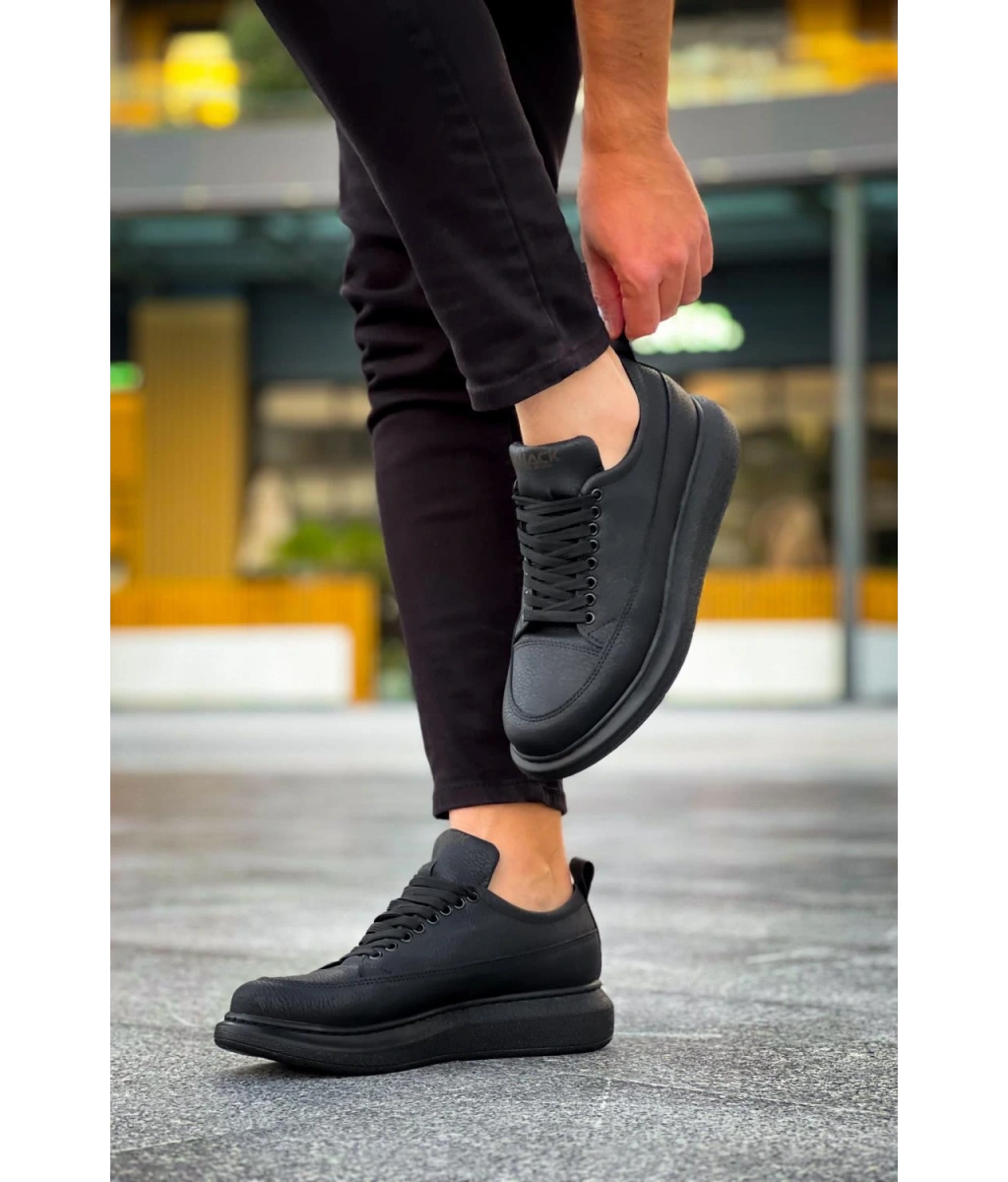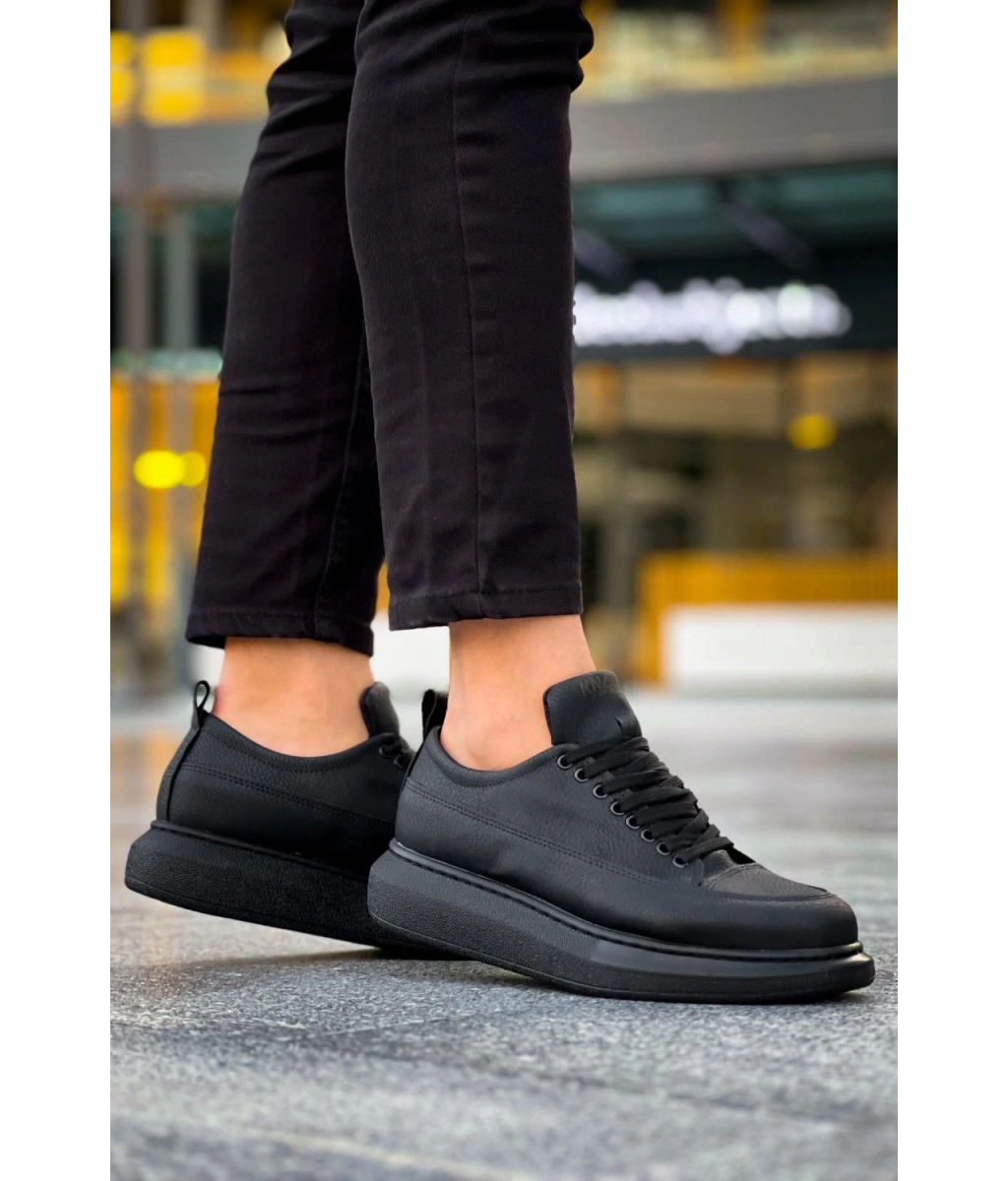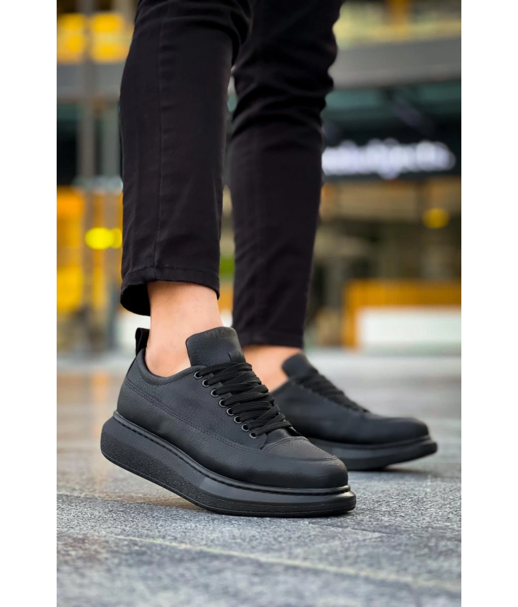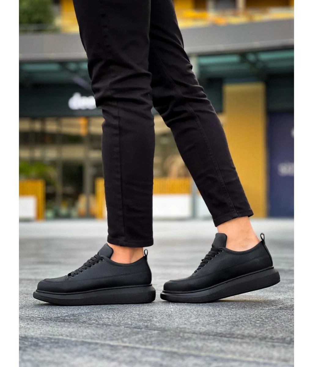 Shoecide Sb0332 Merdiven Desen Bağcıklı Erkek Yüksek Taban Siyah Cilt Beyaz Taban Spor Ayakkabı