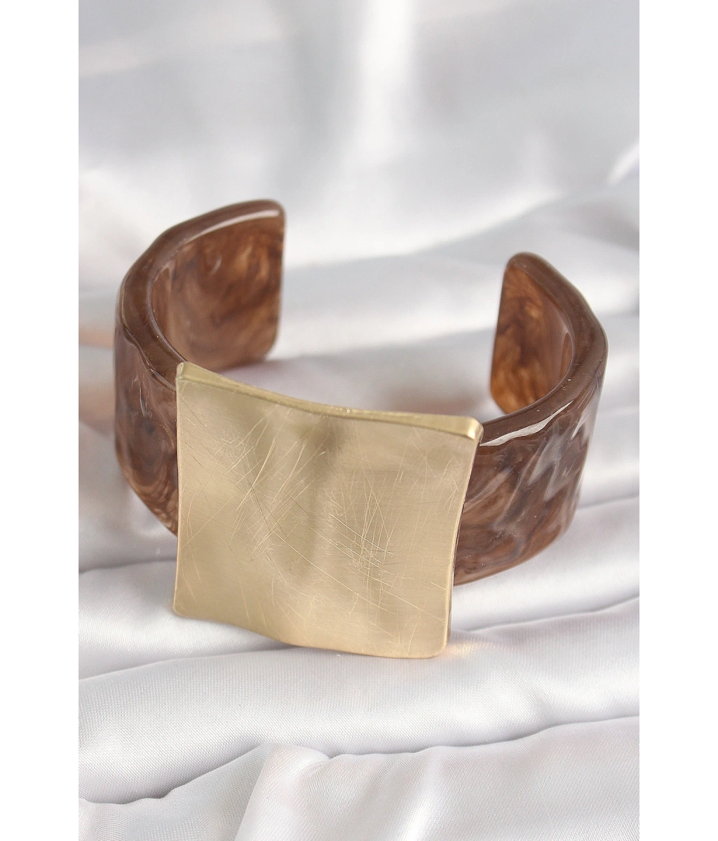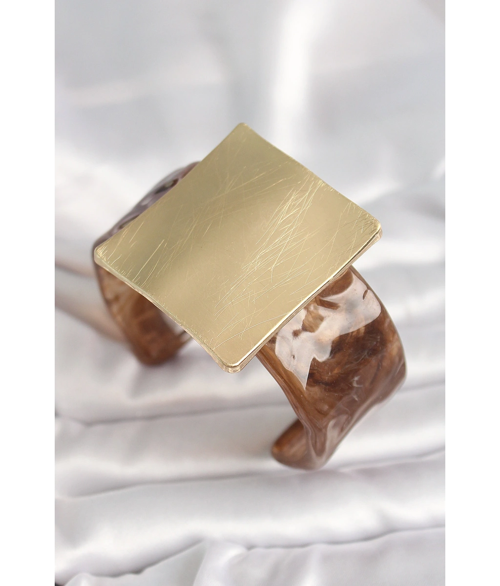 Shoecide Kahverengi Mermer Desen Akrilik Plastik Gold Kare Plaka Model Vintage Kadın Bilezik