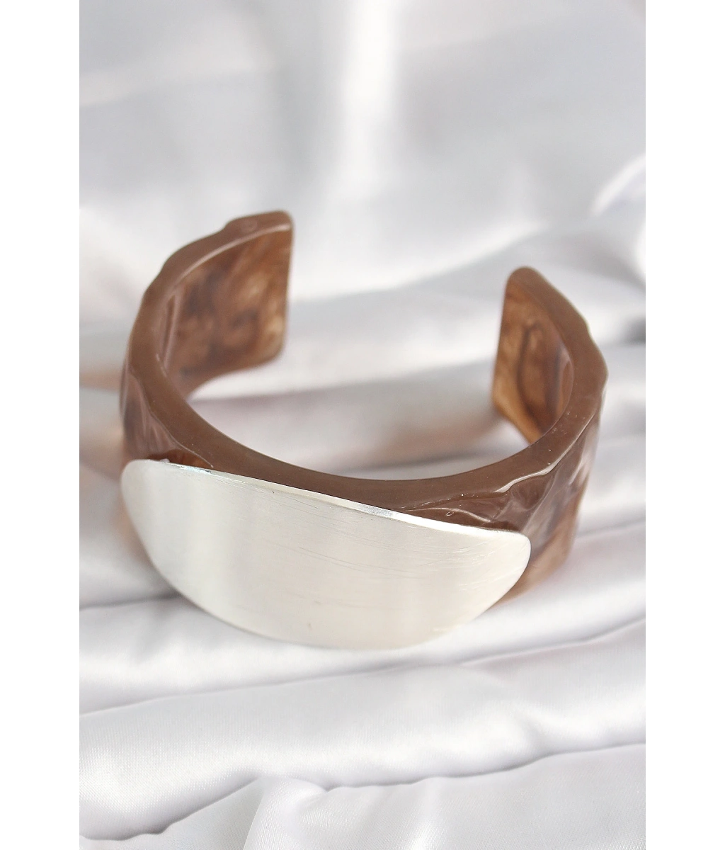 Shoecide Kahverengi Mermer Desen Akrilik Plastik Gümüş Oval Plaka Model Vintage Kadın Bilezik