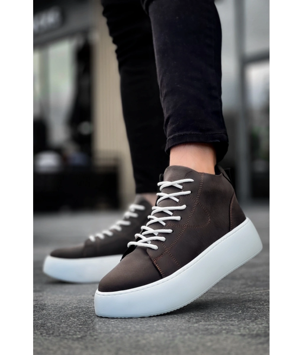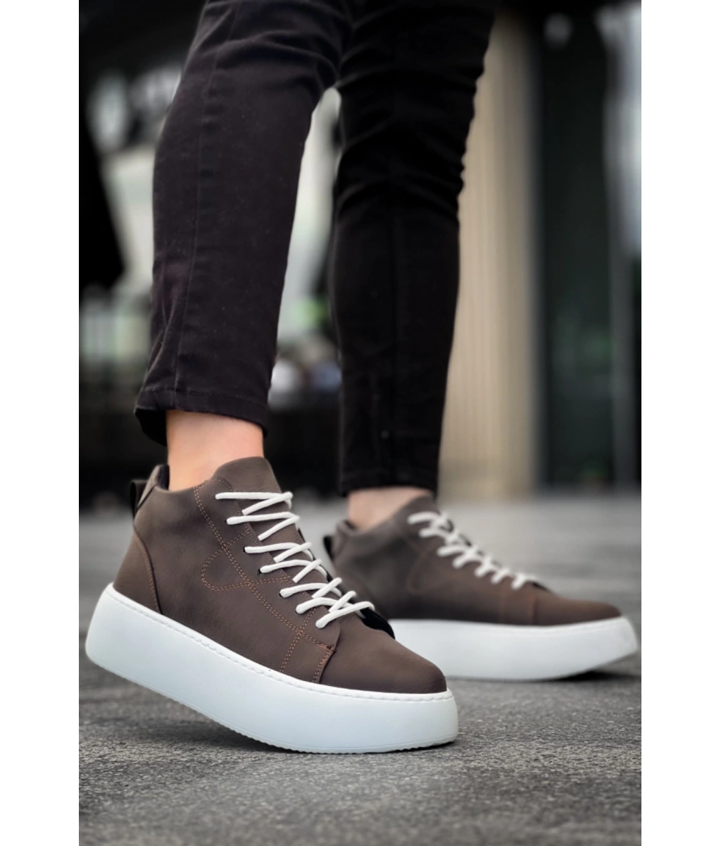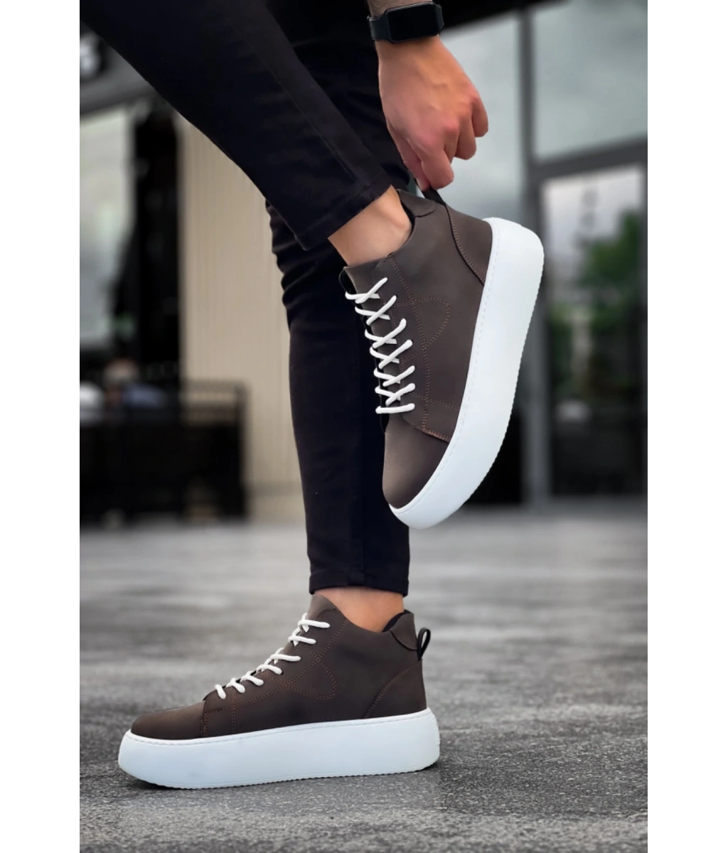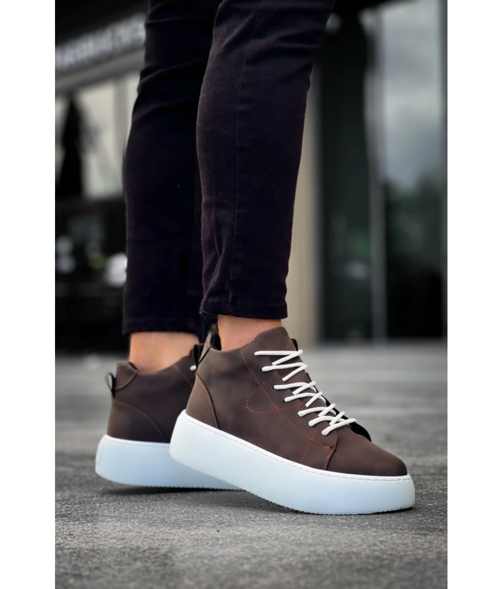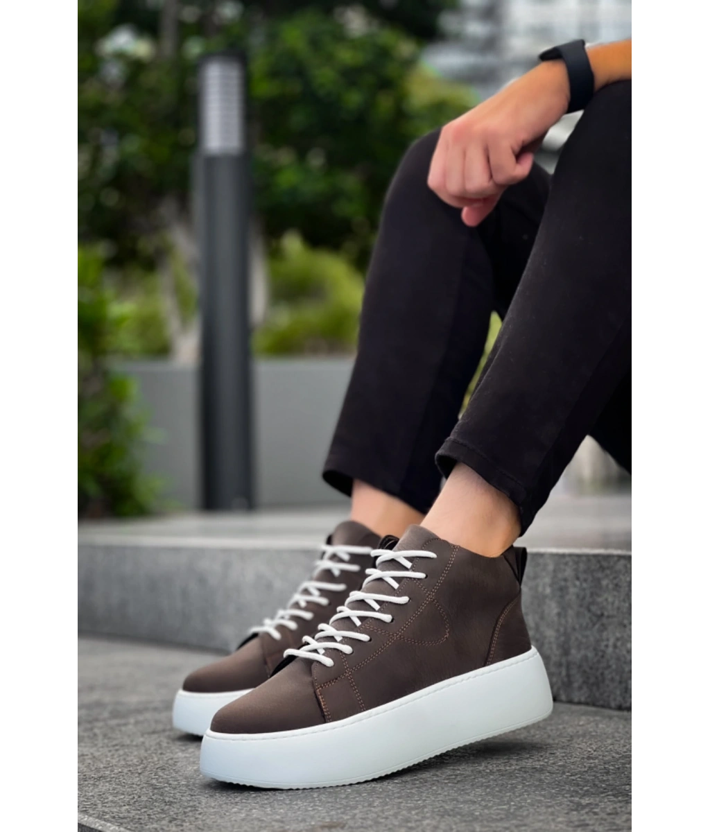 Shoecide Le10 Bağcıklı Erkek Yüksek Beyaz Taban Kahverengi Spor Bot