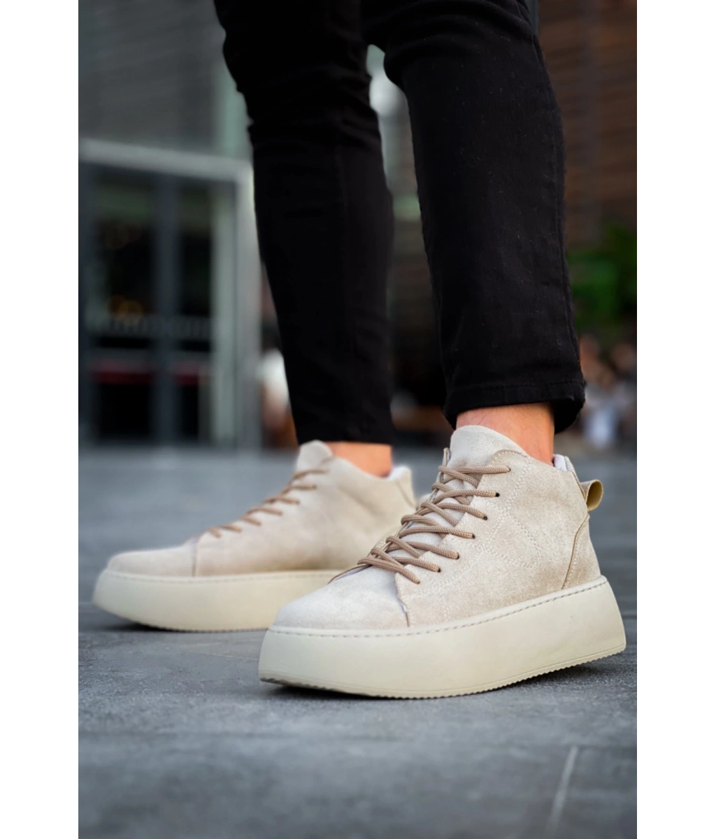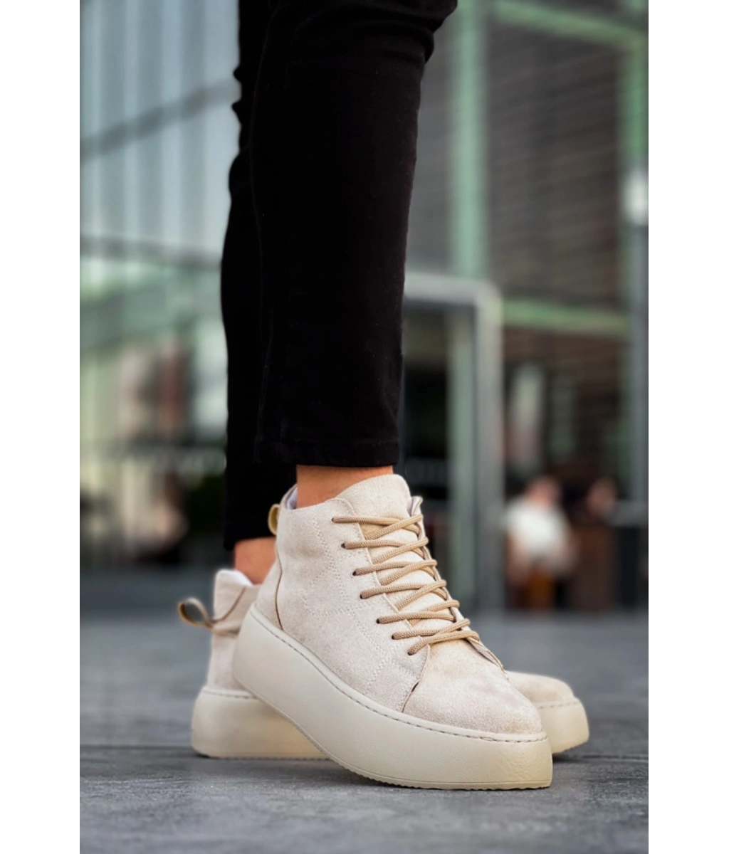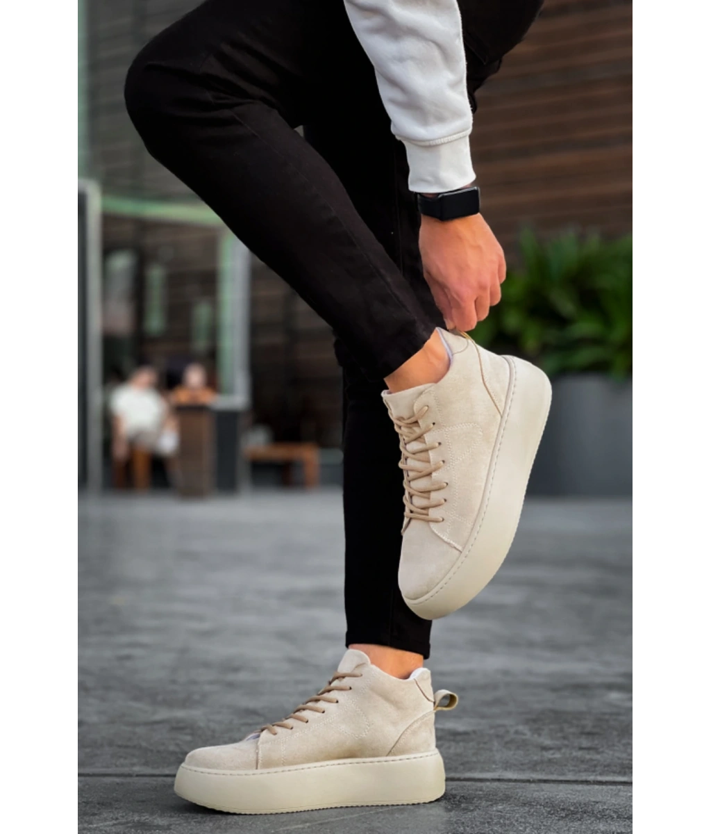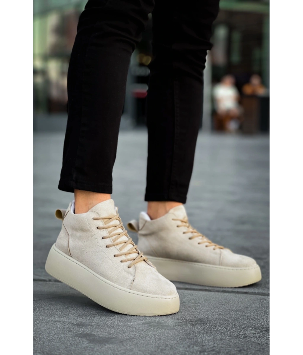 Shoecide Sb0713 Bağcıklı Süet Bej Yüksek Taban Erkek Tarz Spor Bot