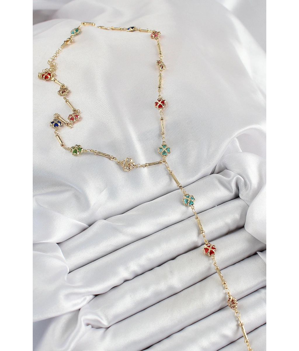 - Ürün materyali pirinçtir.- Ürün zincir uzunluğu 45cm dir.- Dikkatli kullanımda kararma, renk atma olmaz.- Ayrıca teninizin bijuteri , kaplama ürünleri kullanmaya uygun olması gerekmektedir. (Bazı tenlerin karartma yaptığı unutulmamalıdır.)- Sağlıklı ve mutlu günlerde kullanmanız dileğiyle…