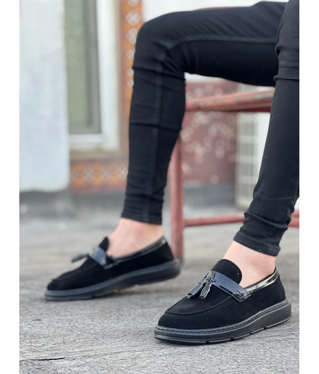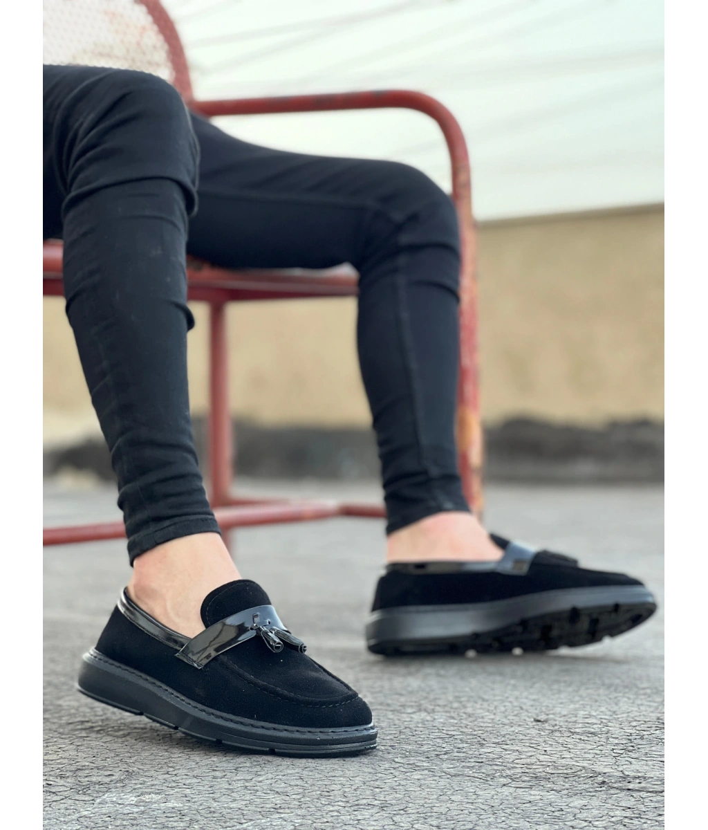 Shoecide Sb0005 Bağcıksız Yüksek Taban Klasik Siyah Süet Parlak Kuşaklı Püsküllü Erkek Ayakkabı