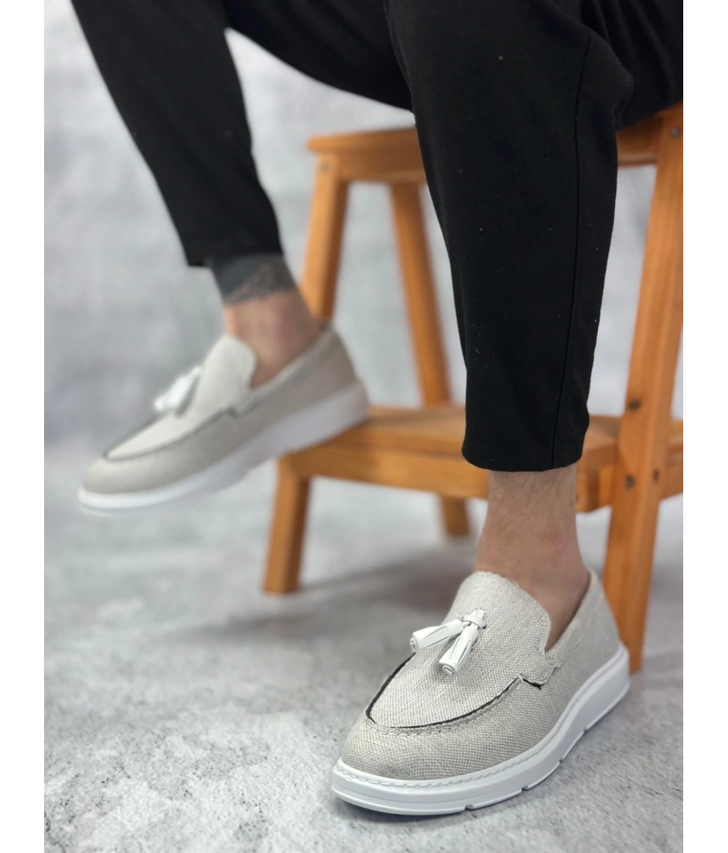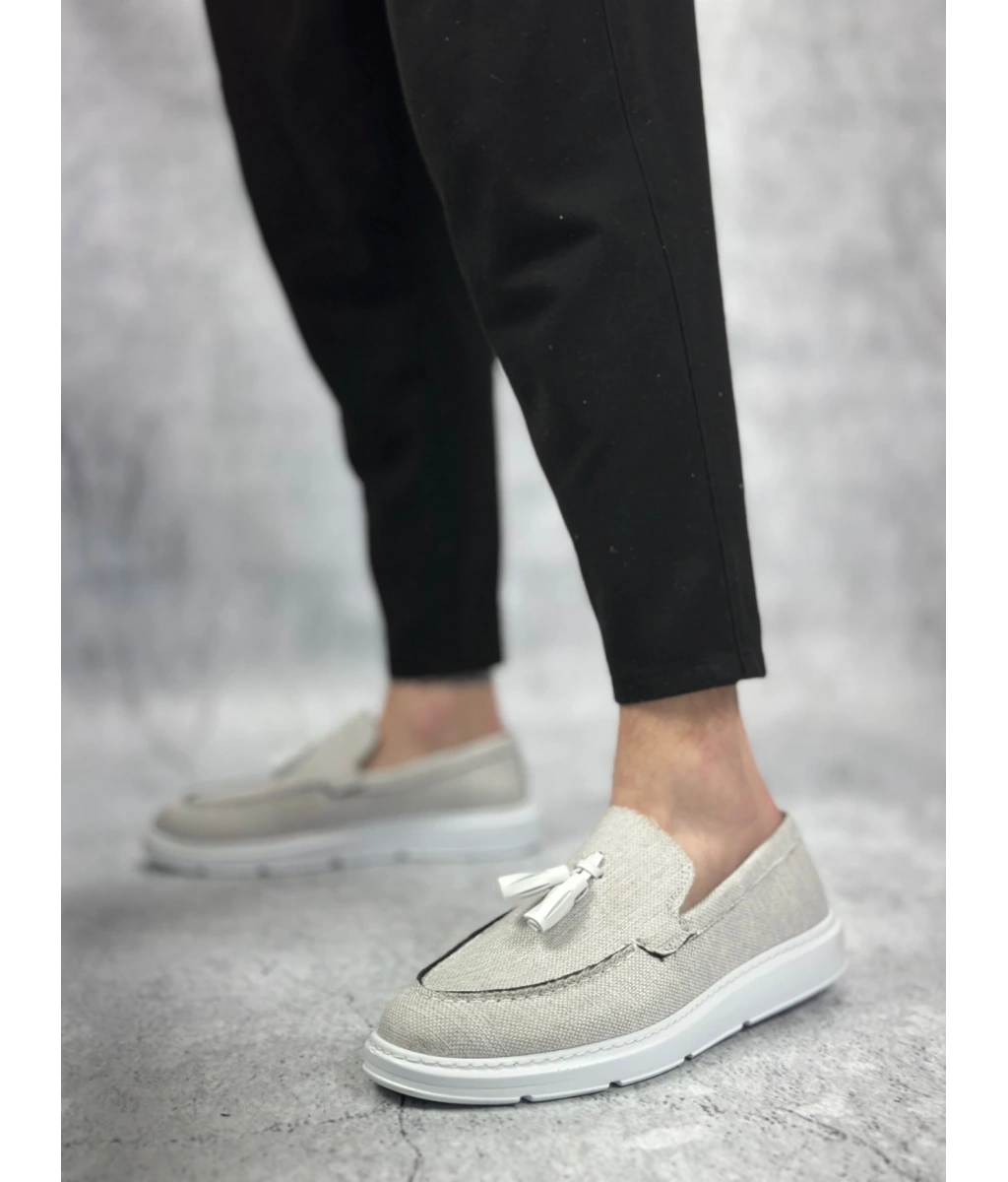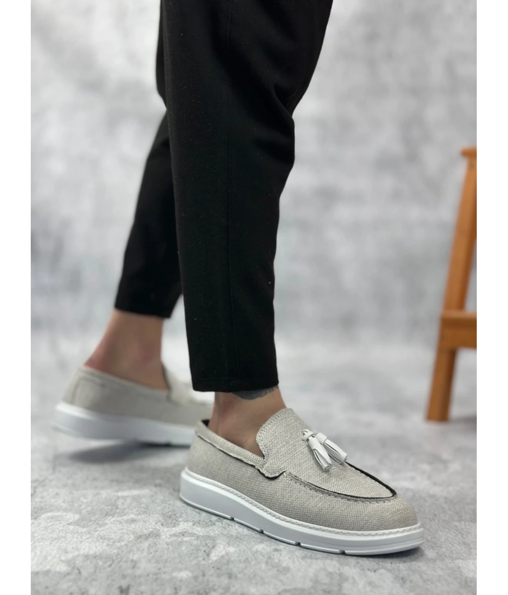 Shoecide Sb0005 Bağcıksız Yüksek Taban Klasik Yeni Keten Gri Püsküllü Erkek Ayakkabı