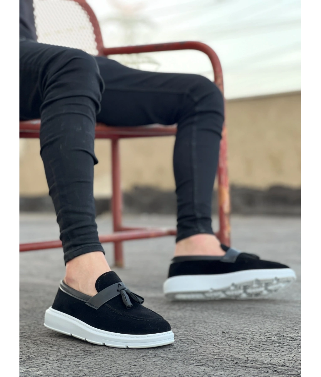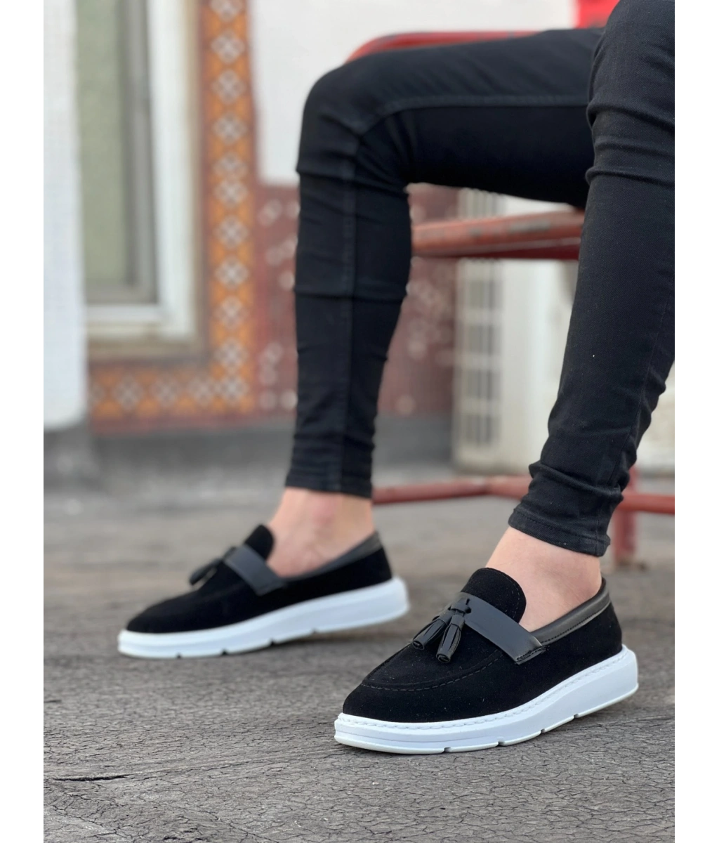 Shoecide Sb0005 Bağcıksız Yüksek Taban Siyah Beyaz Taban Cilt Kemerli Klasik Püsküllü Corcik Erkek Ayakkabı