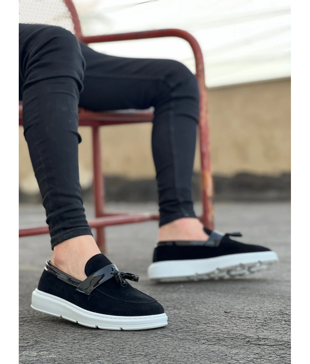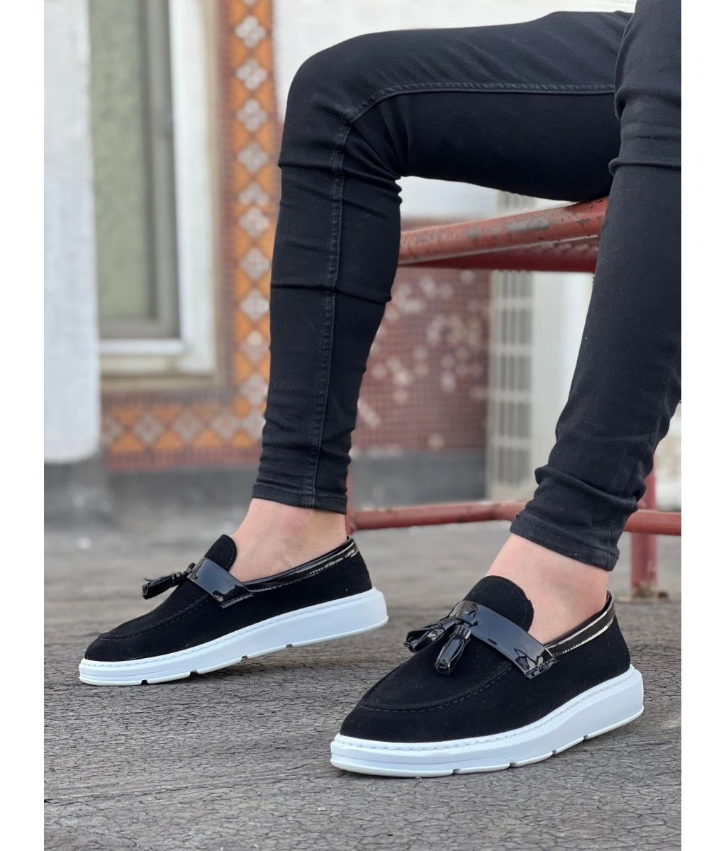 Shoecide Sb0005 Bağcıksız Yüksek Taban Siyah Beyaz Taban Kemerli Klasik Püsküllü Corcik Erkek Ayakkabı