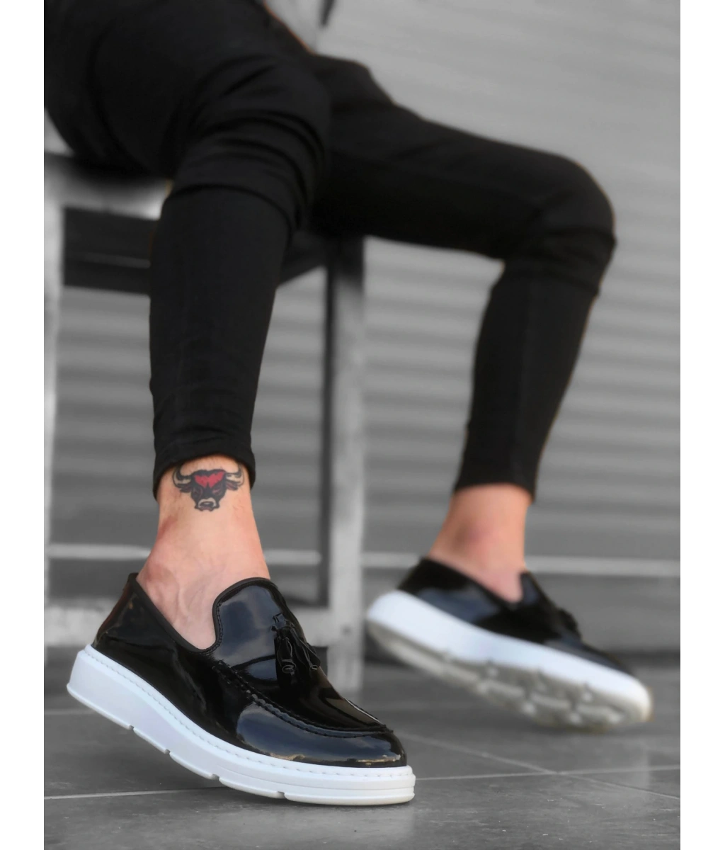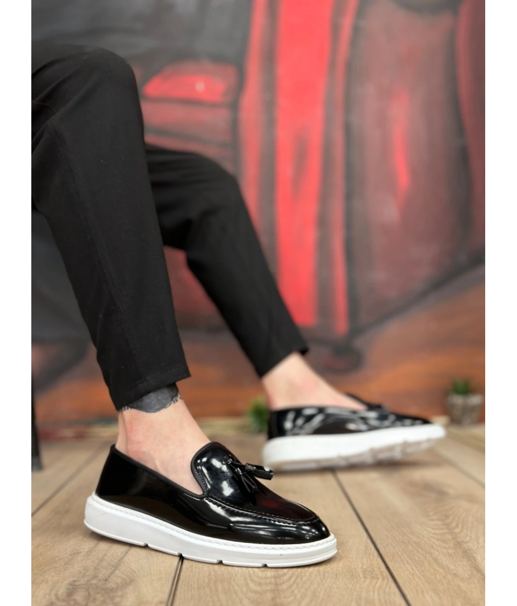 Shoecide Sb0005 Bağcıksız Yüksek Taban Siyah Beyaz Taban Rugan Klasik Püsküllü Corcik Erkek Ayakkabı