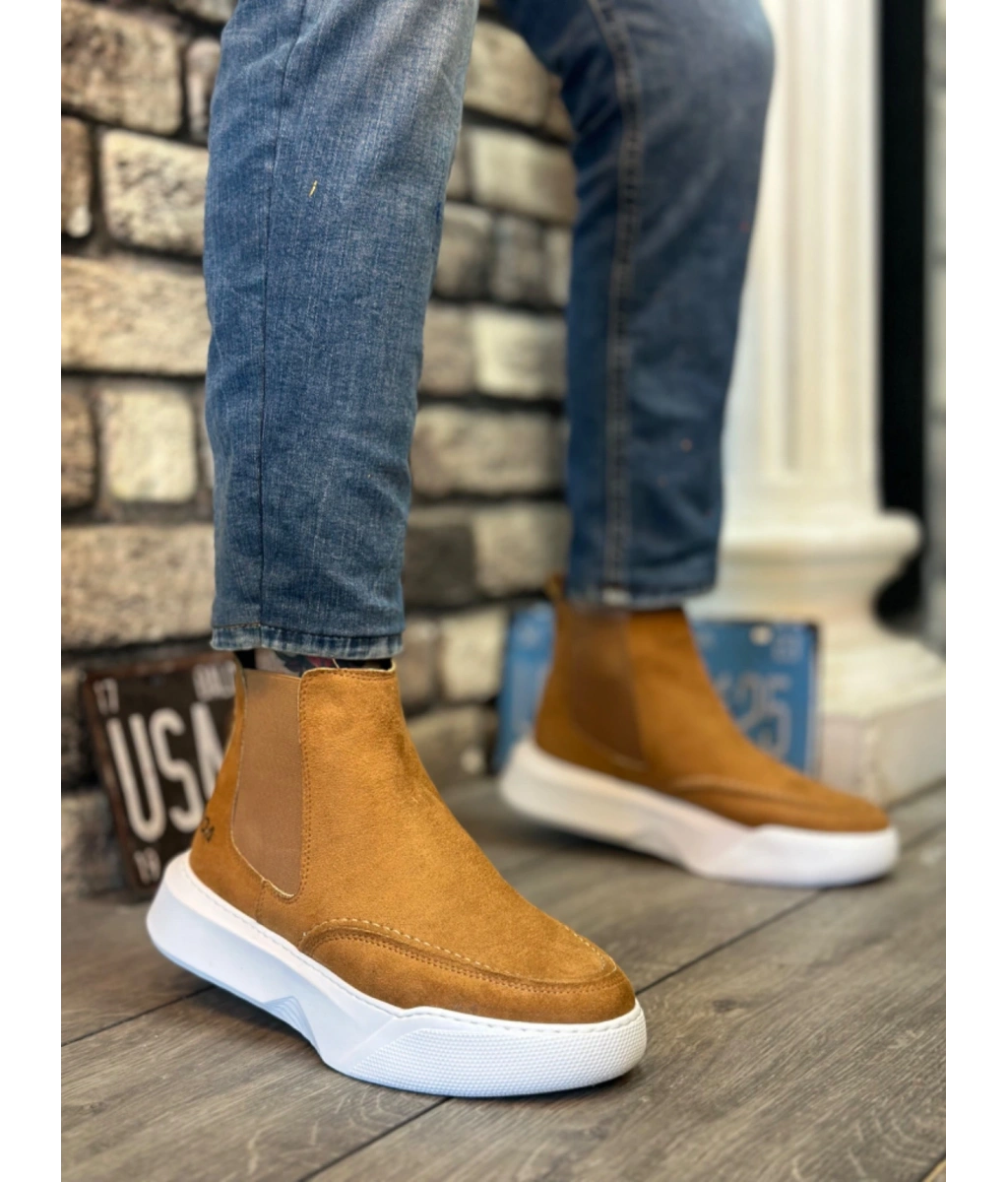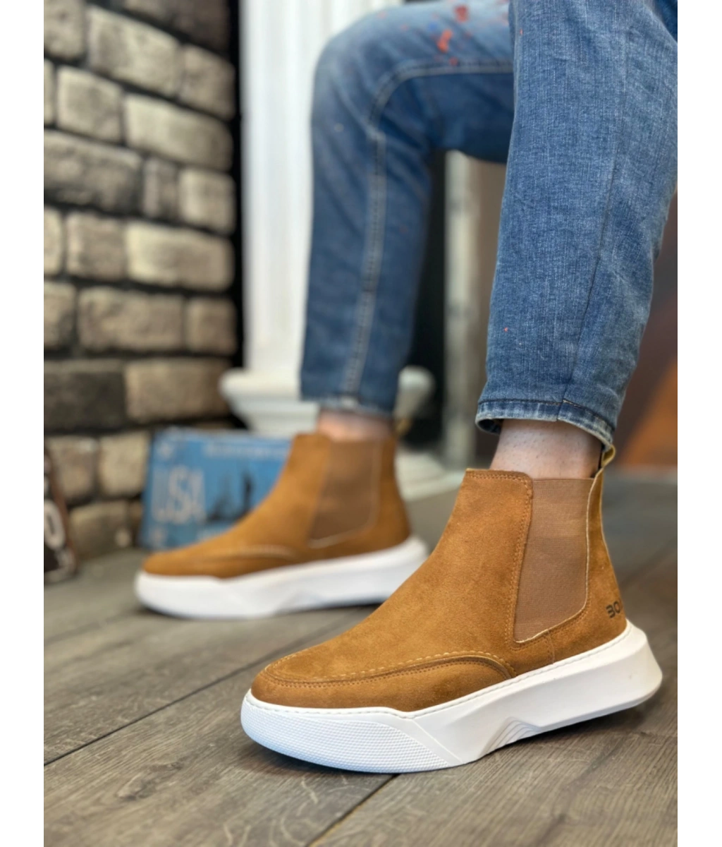 Shoecide Sb0150 Bağcıksız Erkek Taba Süet Beyaz Yüksek Taban Spor Bot