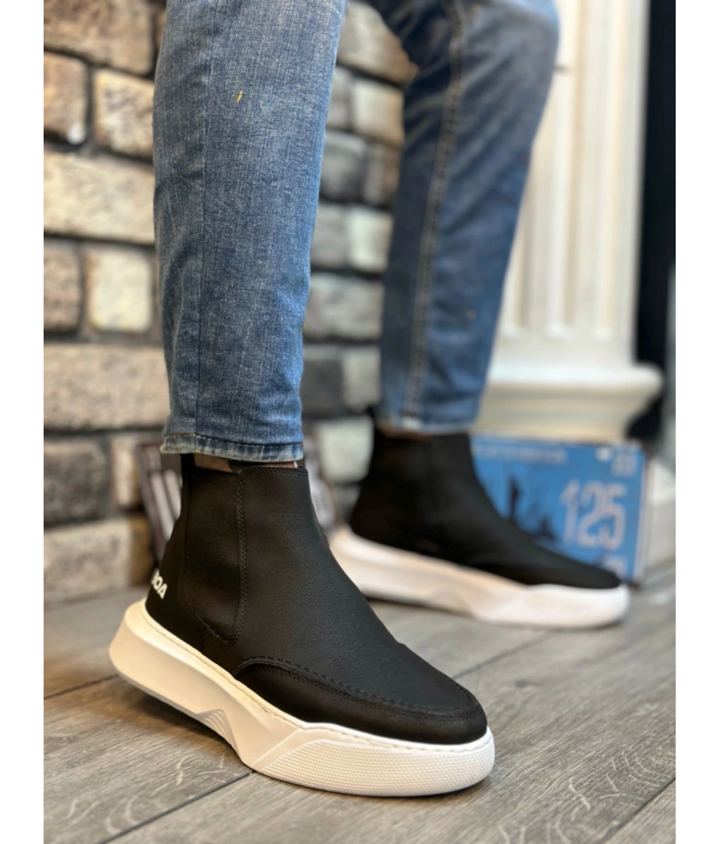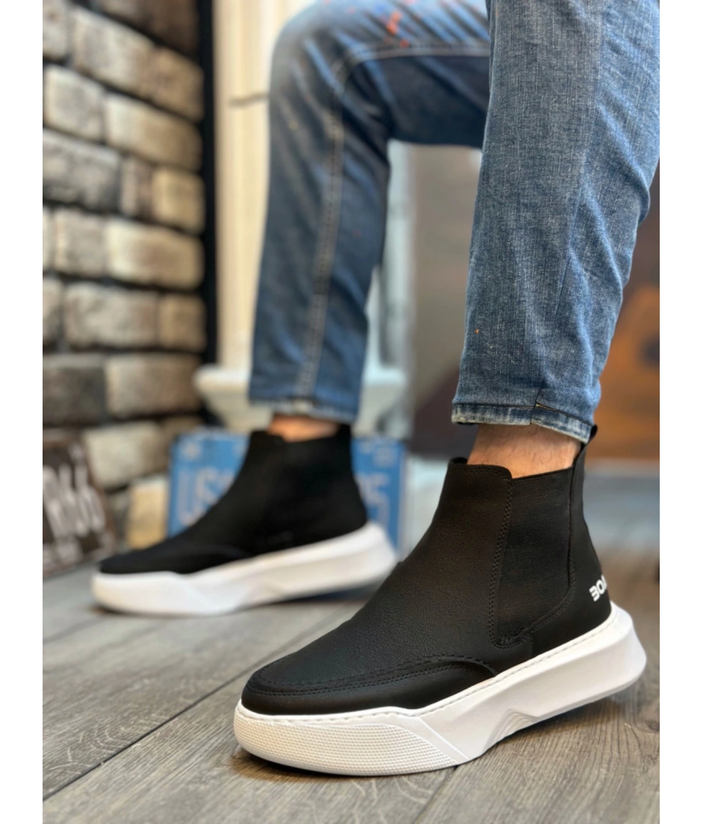 Shoecide Sb0150 Bağcıksız Erkek Yüksek Taban Cilt Siyah Beyaz Spor Bot