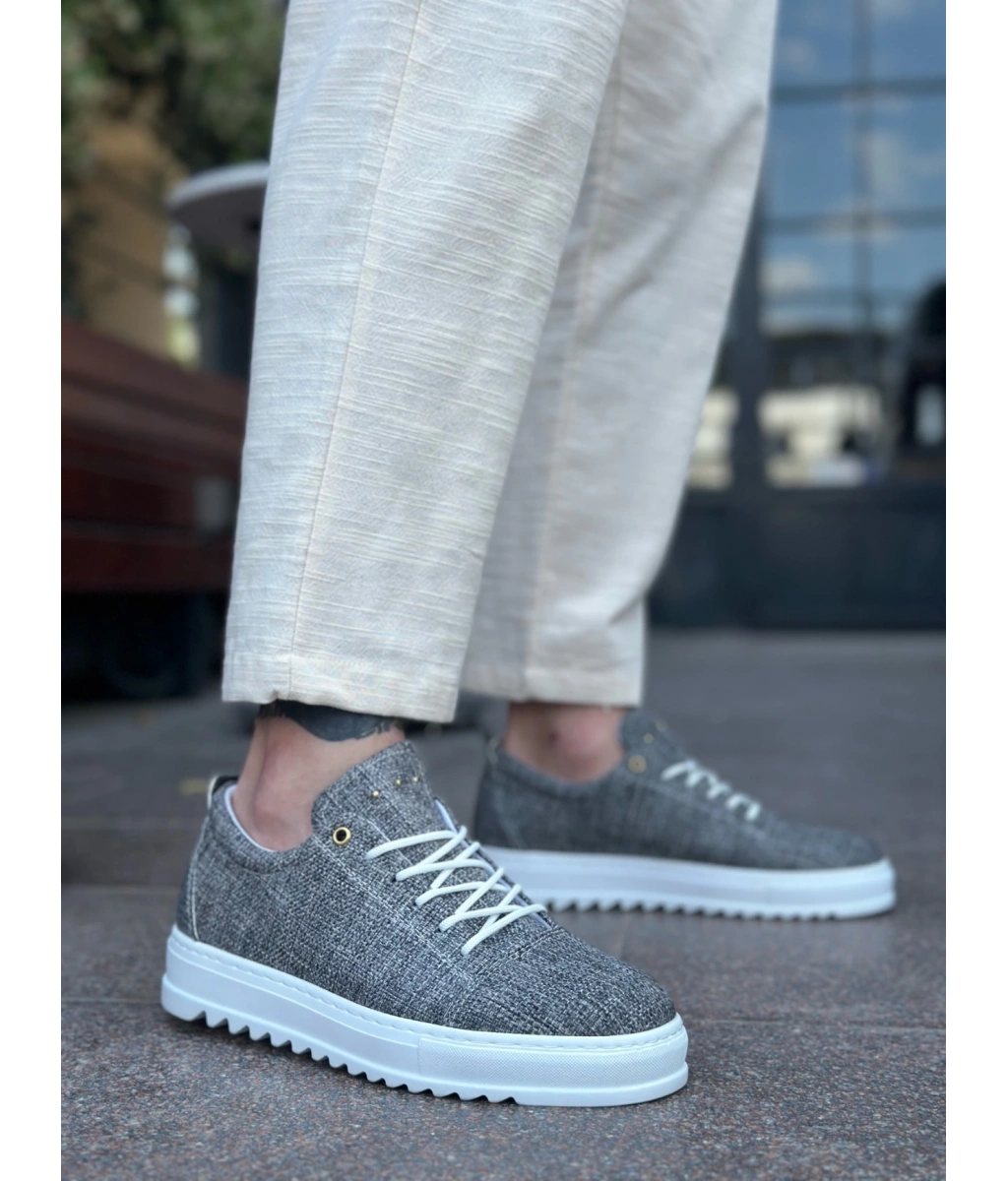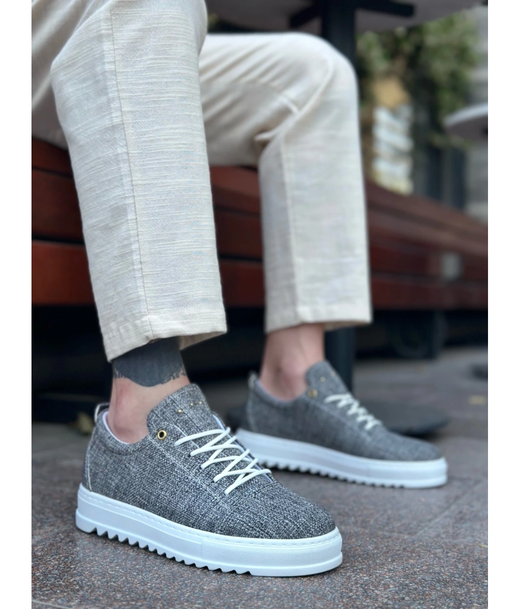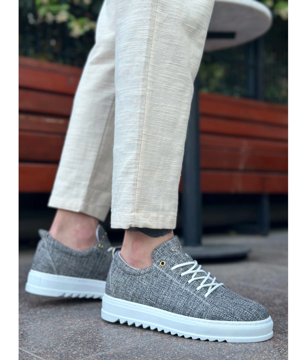 Shoecide Sb0152 Bağcıklı Yüksek Taban Gri Kırçıllı Keten Erkek Ayakkabı