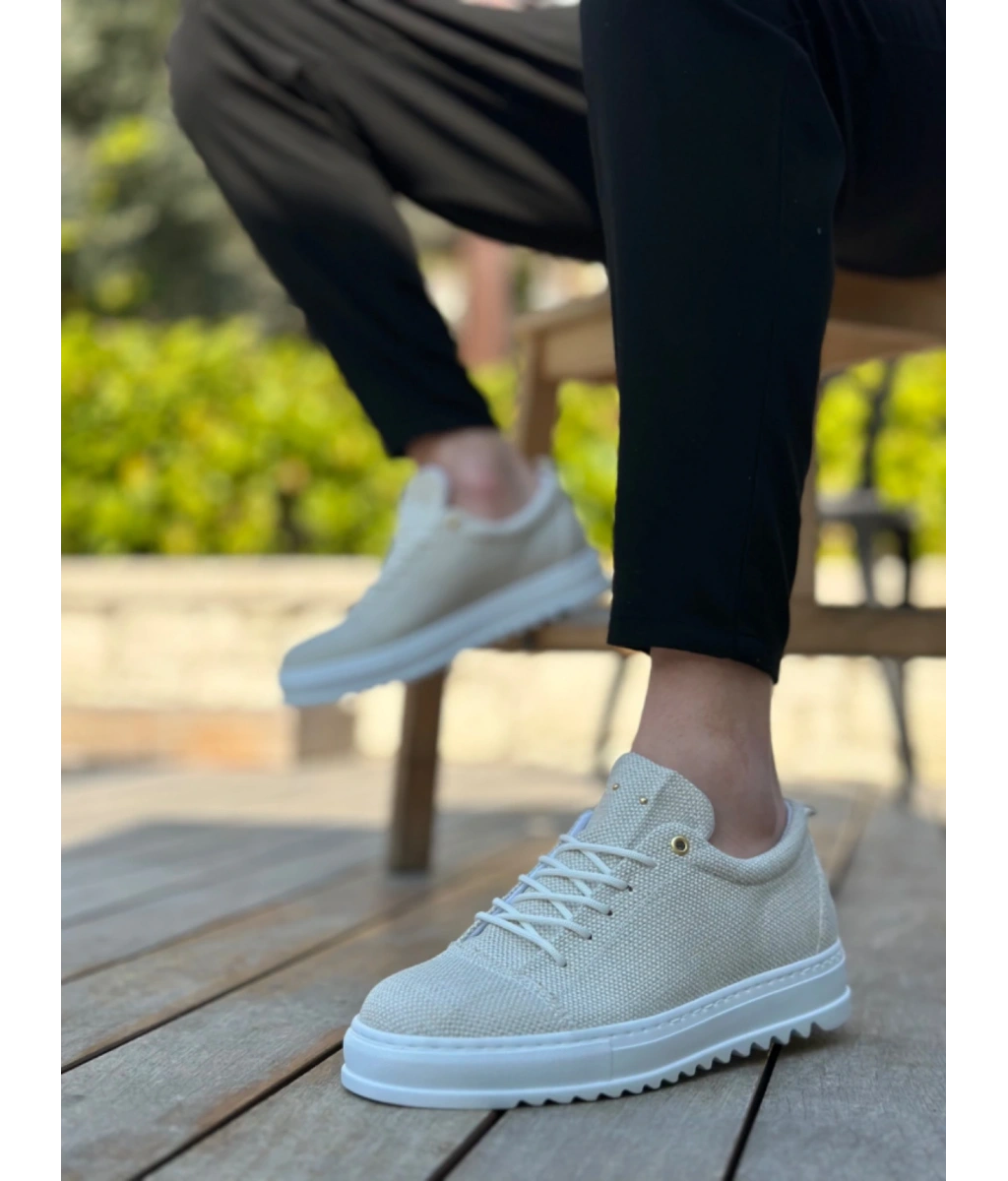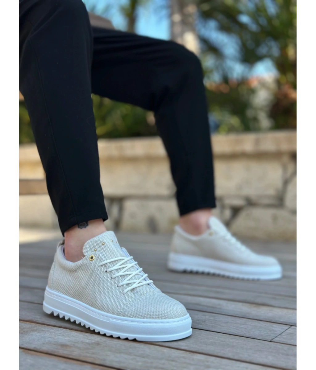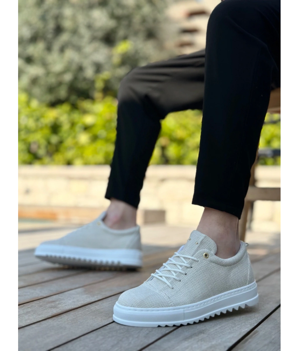 Shoecide Sb0152 Bağcıklı Yüksek Taban Krem Keten Erkek Ayakkabı
