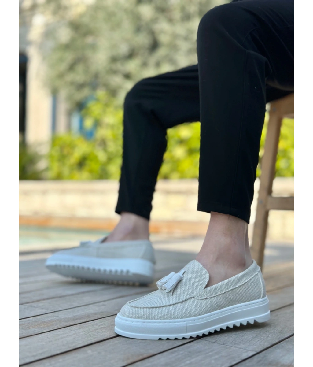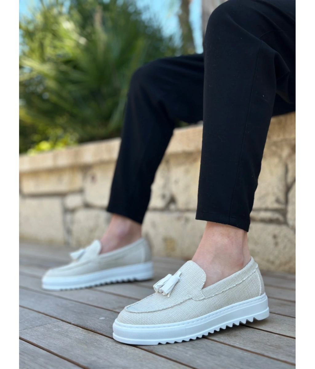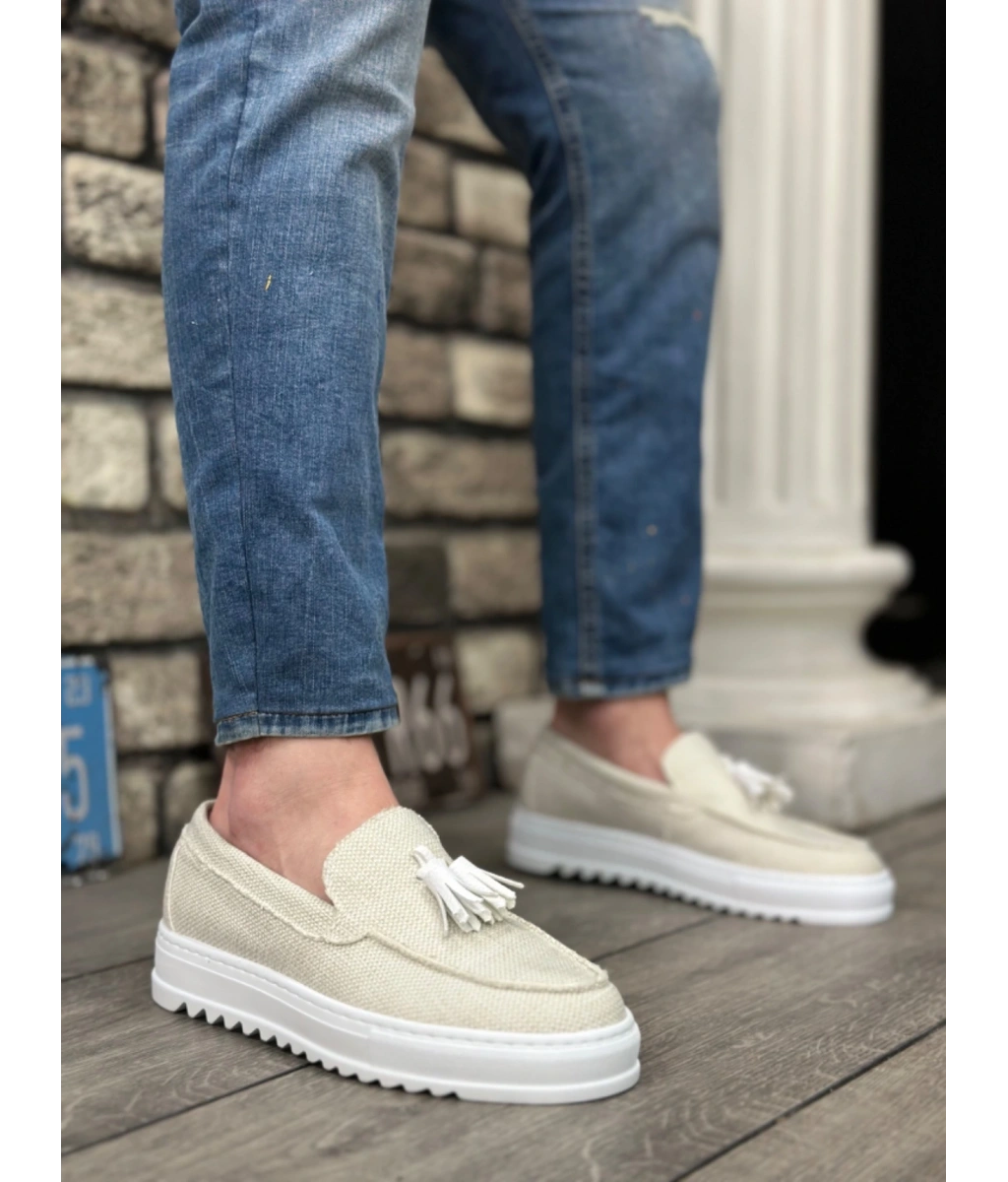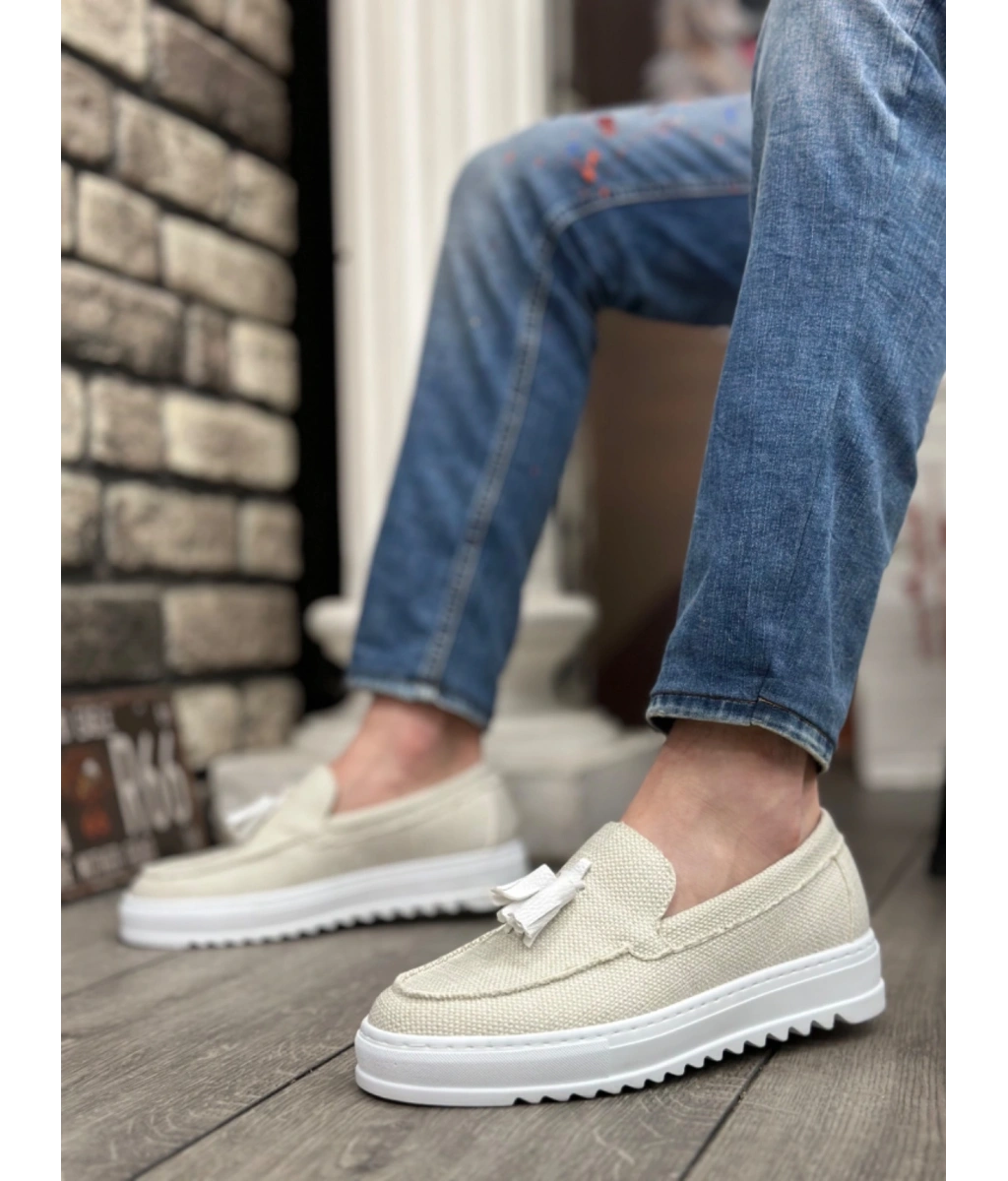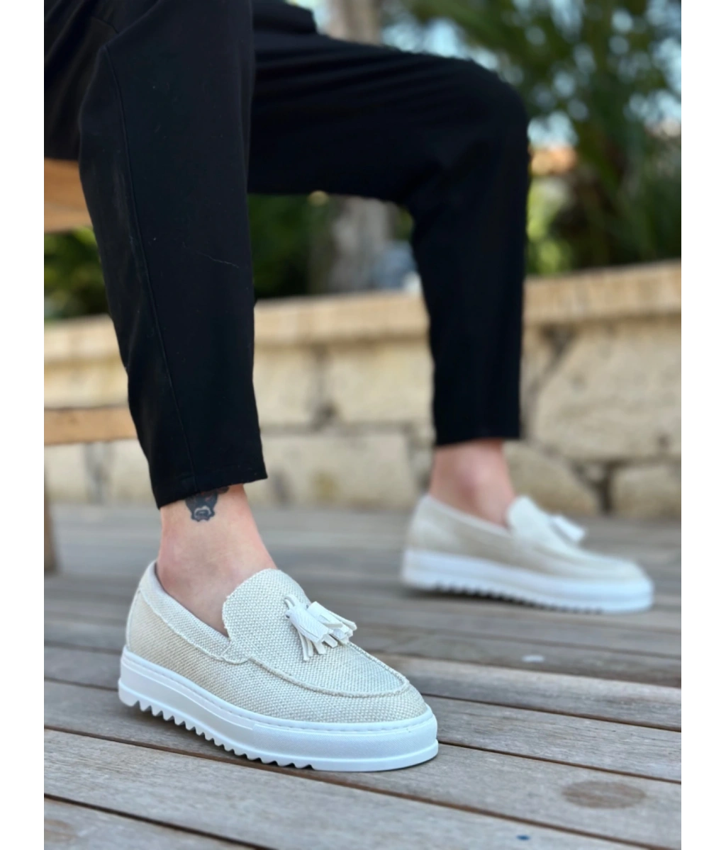 Shoecide Sb0154 Bağcıksız Yüksek Taban Beyaz Keten Püsküllü Erkek Ayakkabı