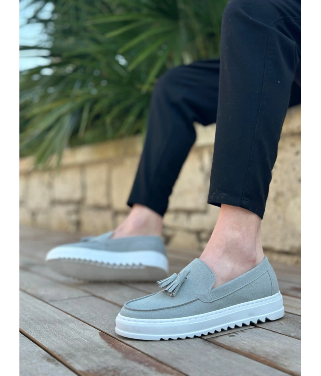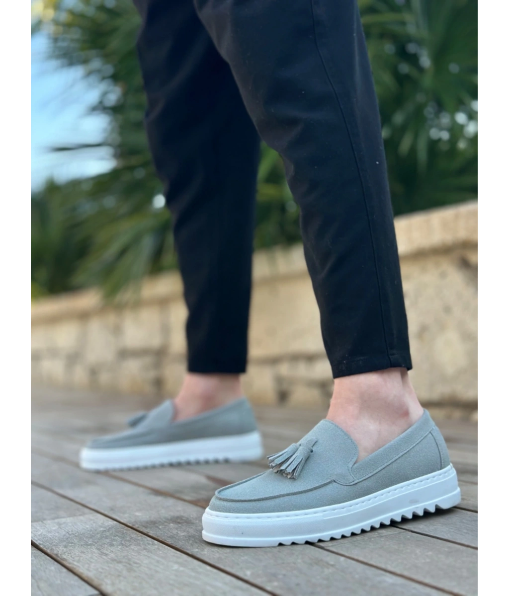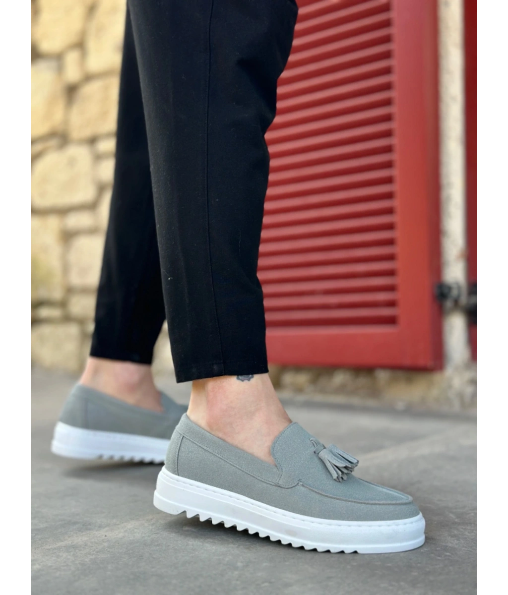 Shoecide Sb0154 Bağcıksız Yüksek Taban Gri Süet Püsküllü Erkek Ayakkabı