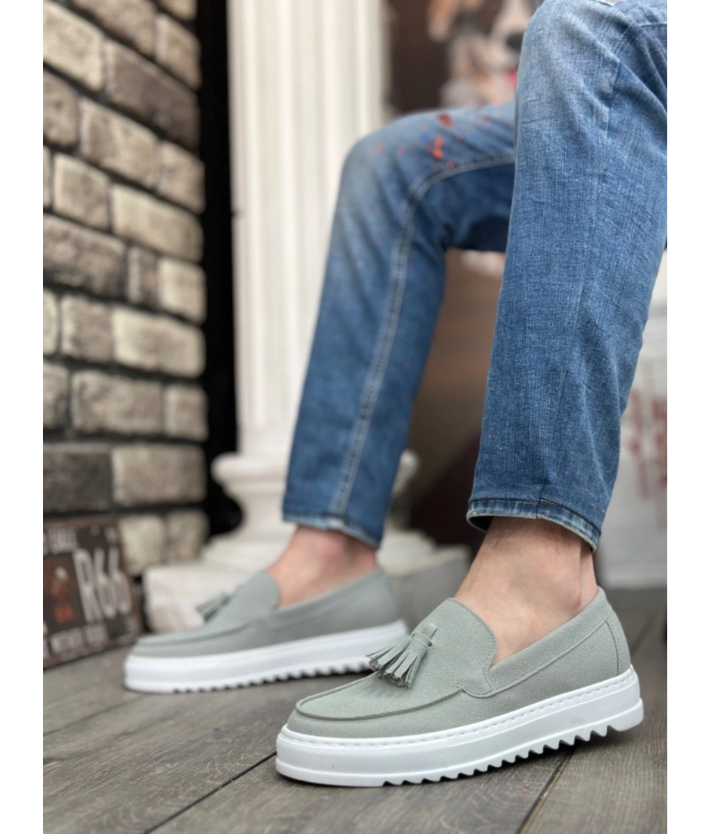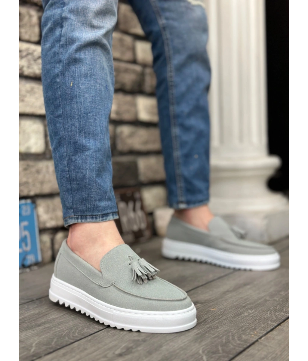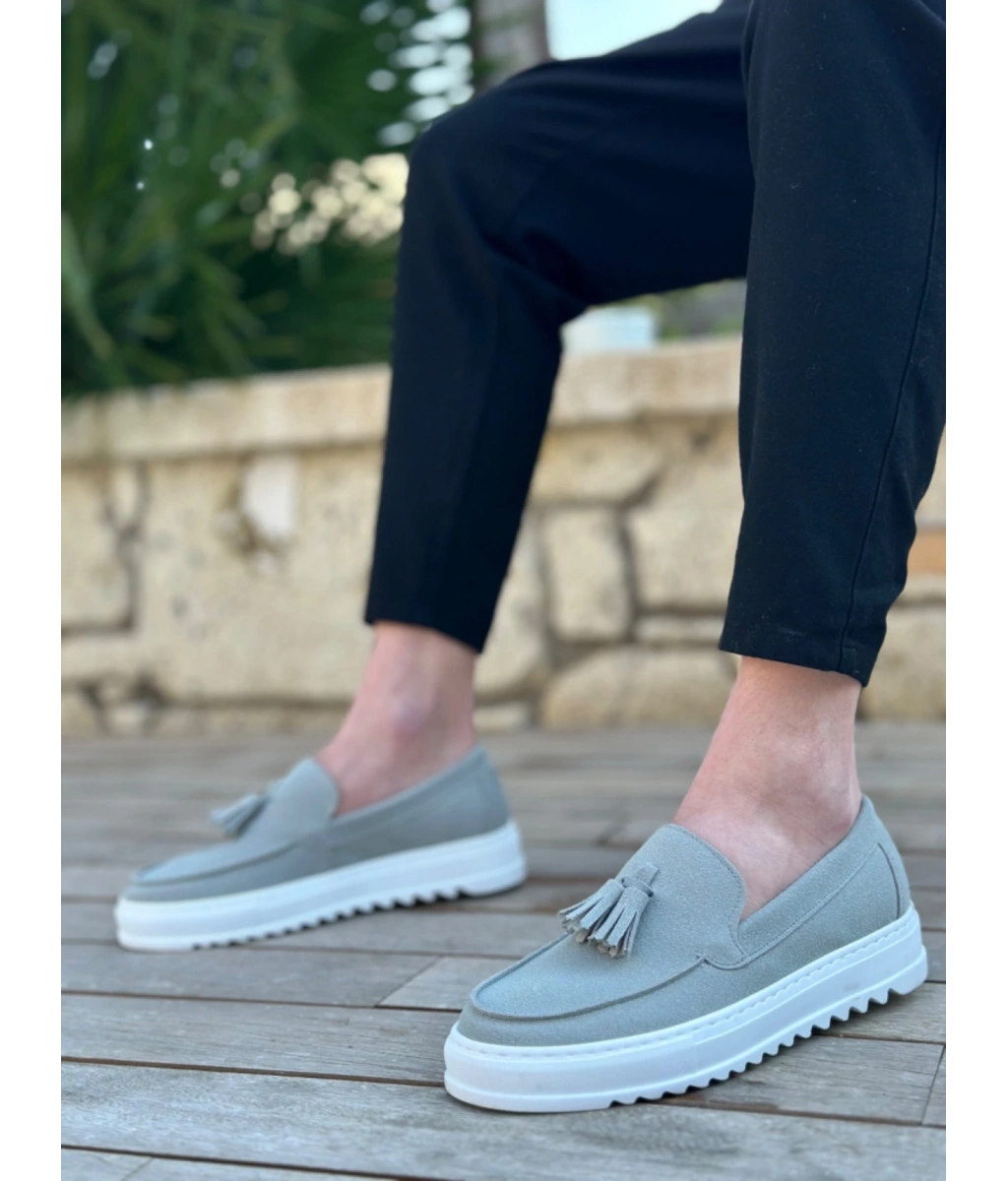 Shoecide Sb0154 Bağcıksız Yüksek Taban Gri Süet Püsküllü Erkek Ayakkabı