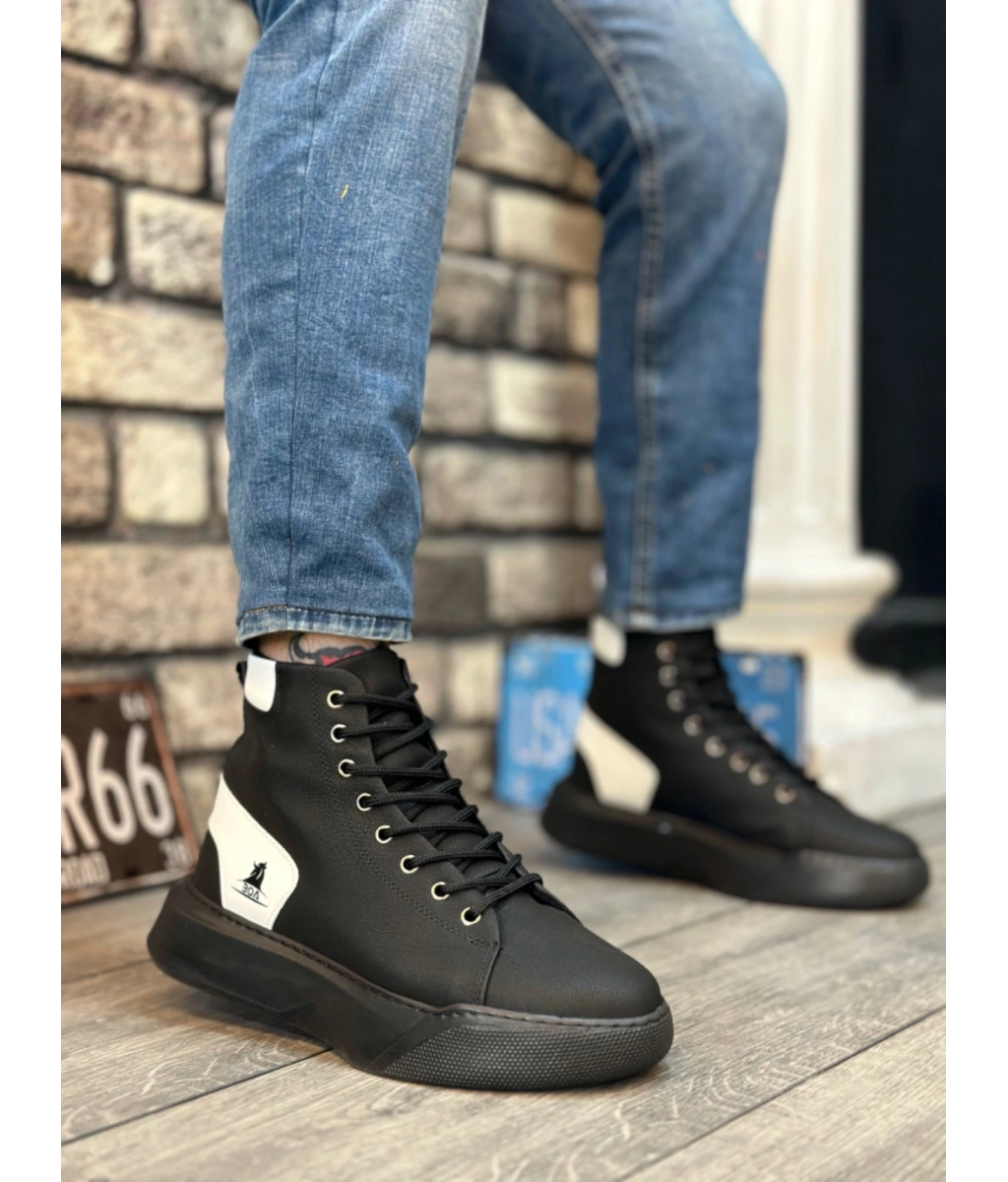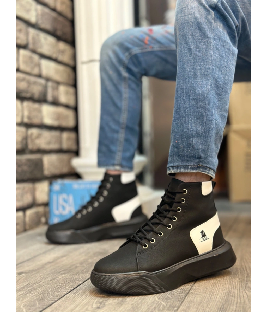 Shoecide Sb0155 Bağcıklı Erkek Yüksek Taban Siyah Beyaz Spor Bot