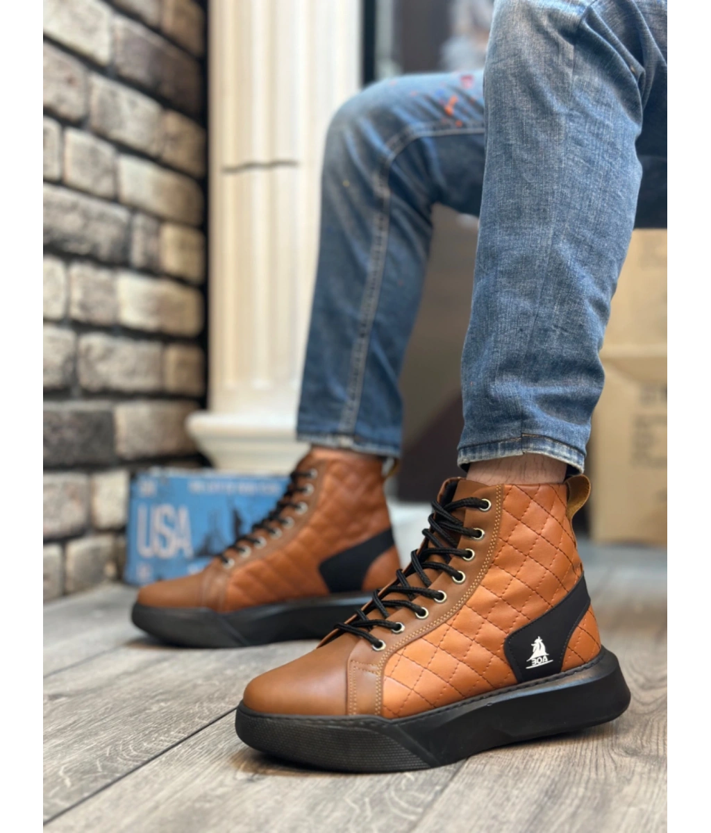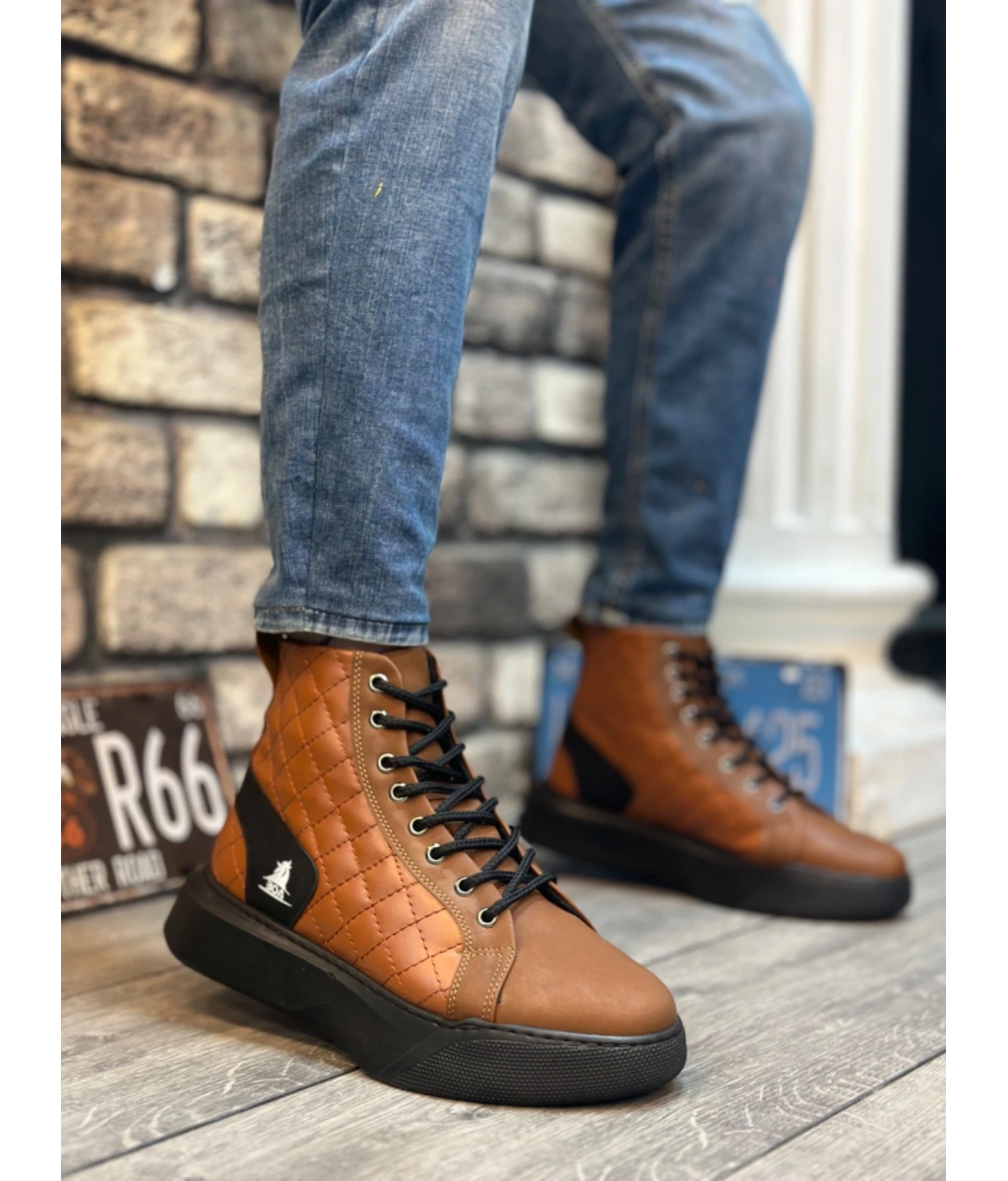Shoecide Sb0159 Bağcıklı Koyu Taba Kapitone Erkek Yüksek Taban Spor Bot