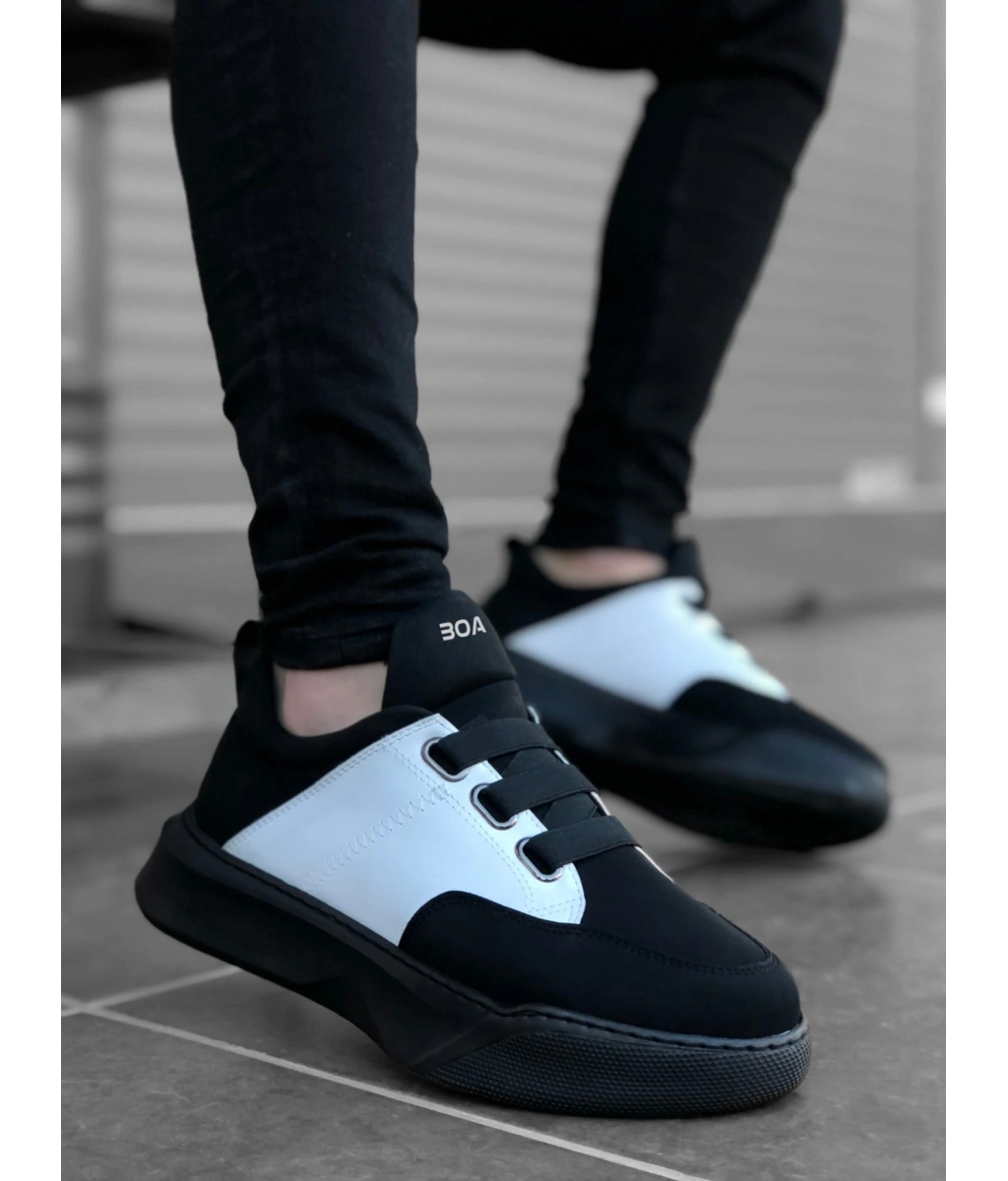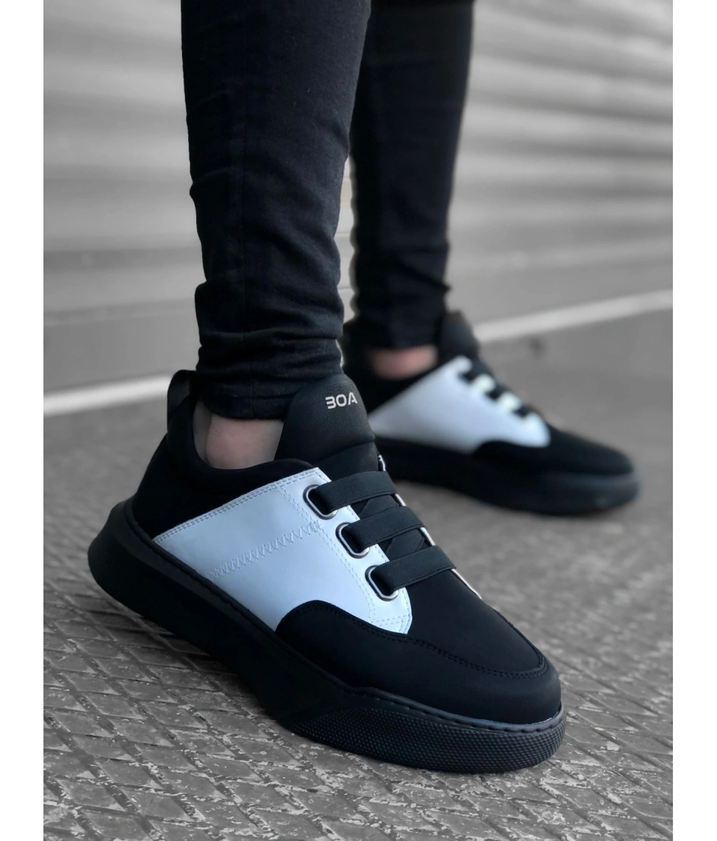 Shoecide Sb0160 Bantlı Erkek Yüksek Taban Siyah Beyaz Siyah Taban Spor Ayakkabı