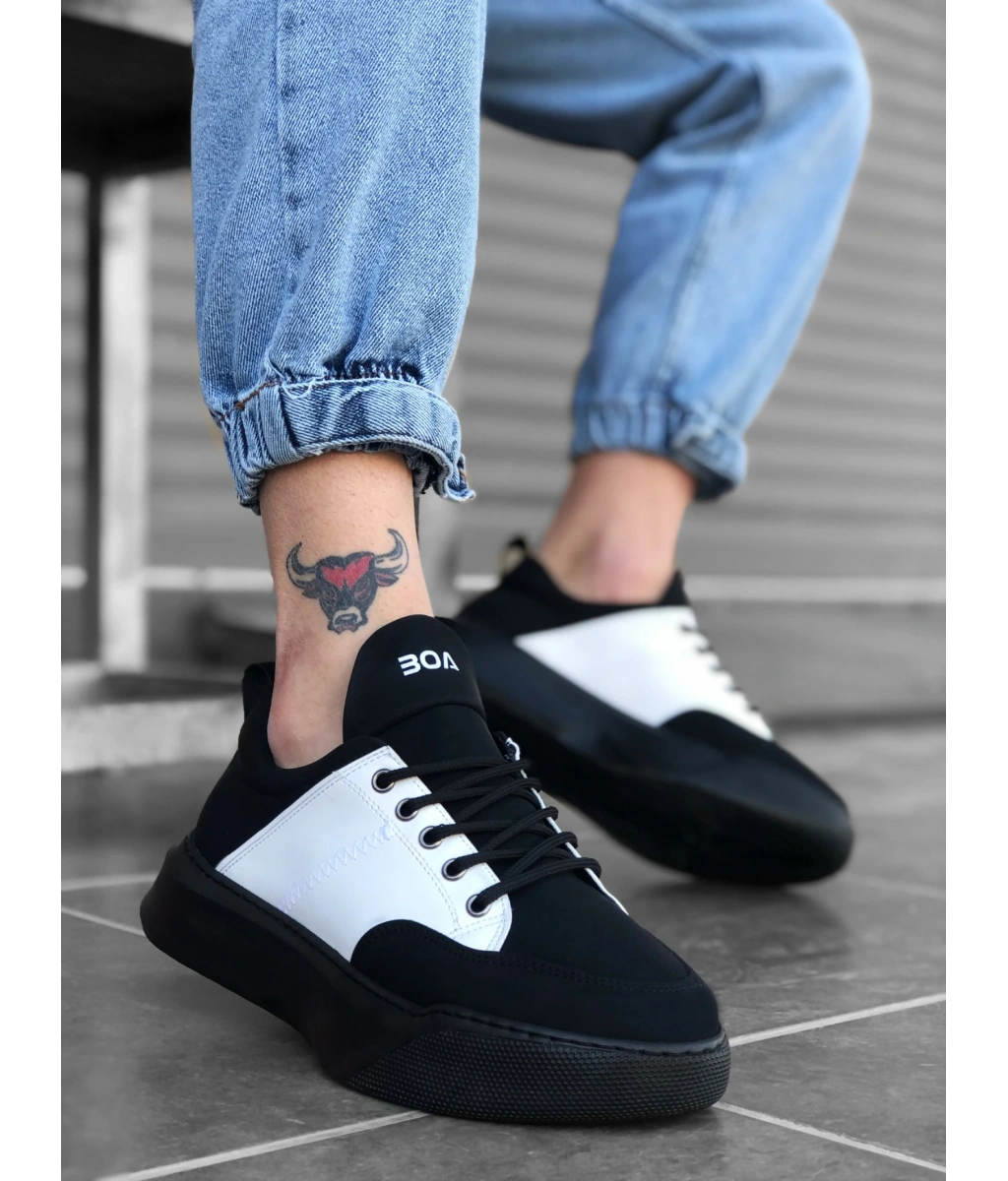 Shoecide Sb0163 Bağcıklı Erkek Yüksek Taban Siyah Beyaz Spor Ayakkabı