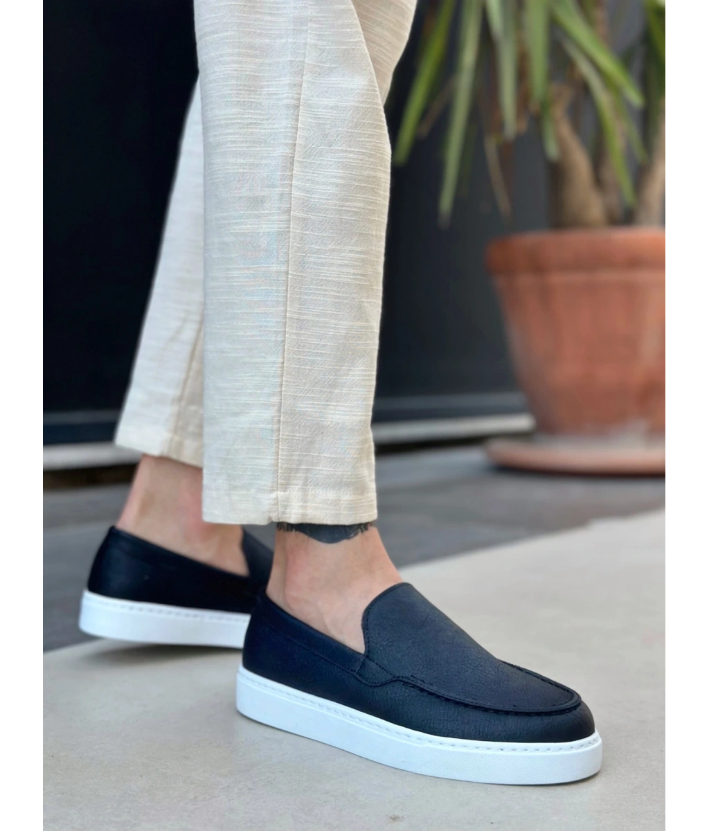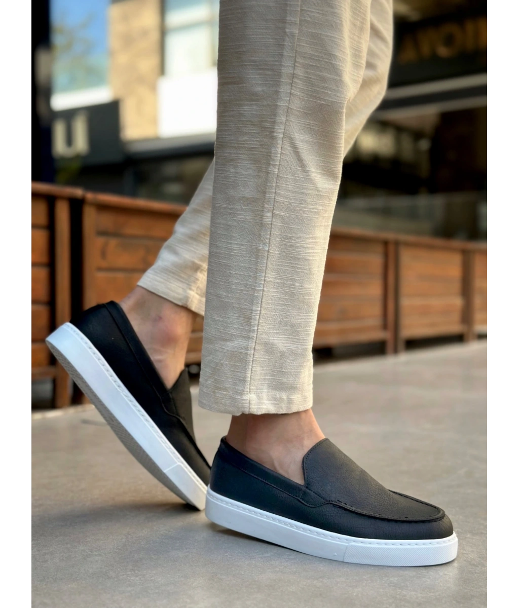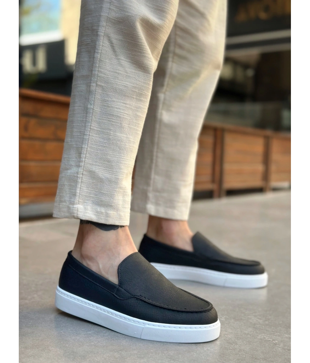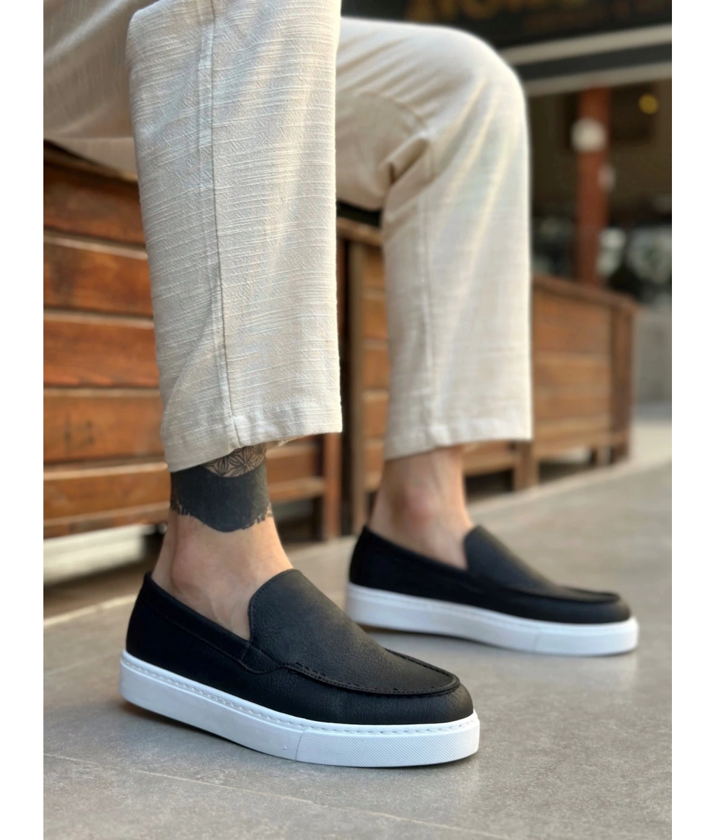 Shoecide Sb0241 Bağcıksız Yüksek Taban Siyah Beyaz Taban Cilt Erkek Ayakkabı