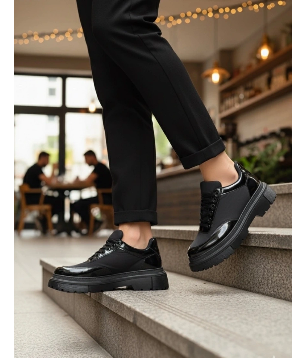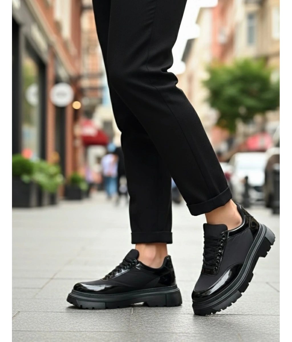 Shoecide Sb0243 Bağcıklı Rugan Paraşüt Detaylı Yüksek Taban Siyah Erkek Ayakkabı