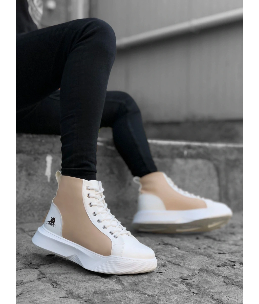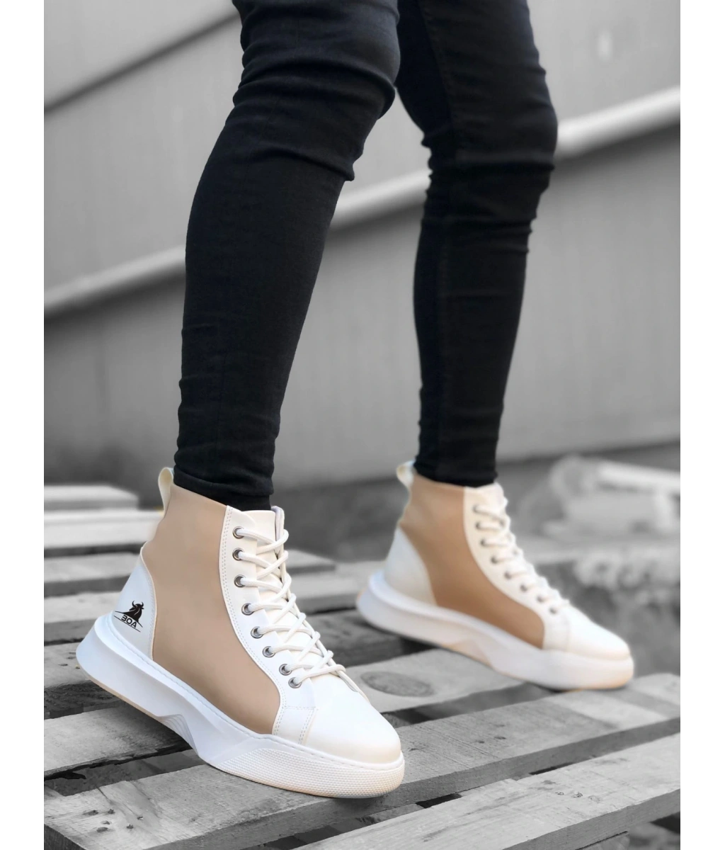 Shoecide Sb0256 Bağcıklı Erkek Yüksek Taban Beyaz Krem Taban Spor Bot