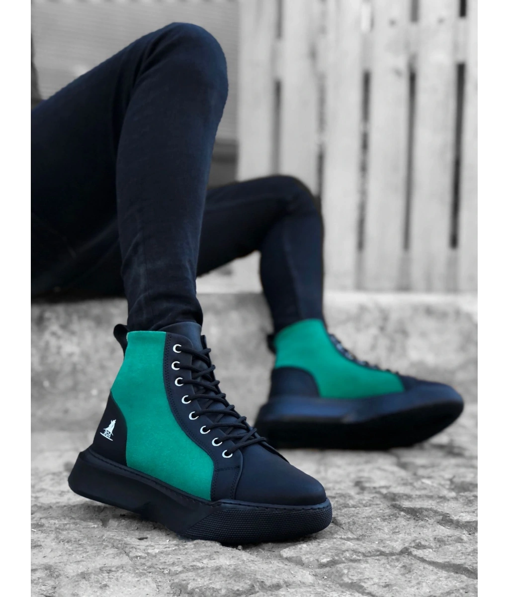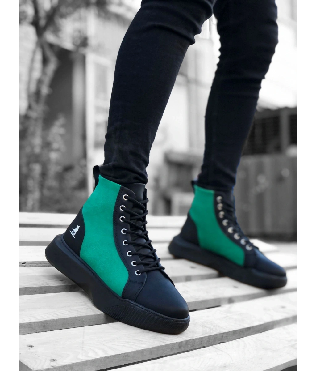 Shoecide Sb0256 Bağcıklı Erkek Yüksek Taban Siyah Yeşil Taban Spor Bot
