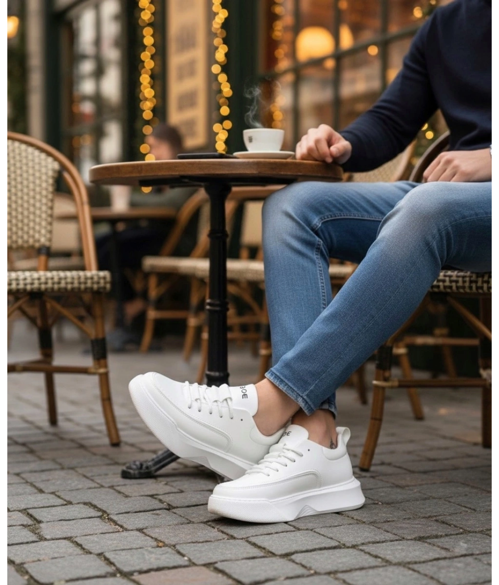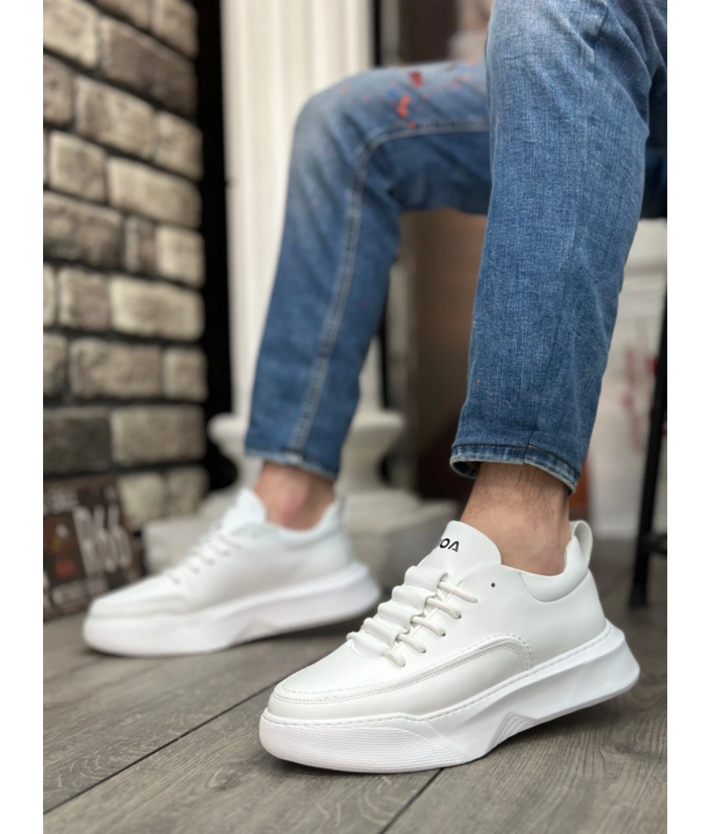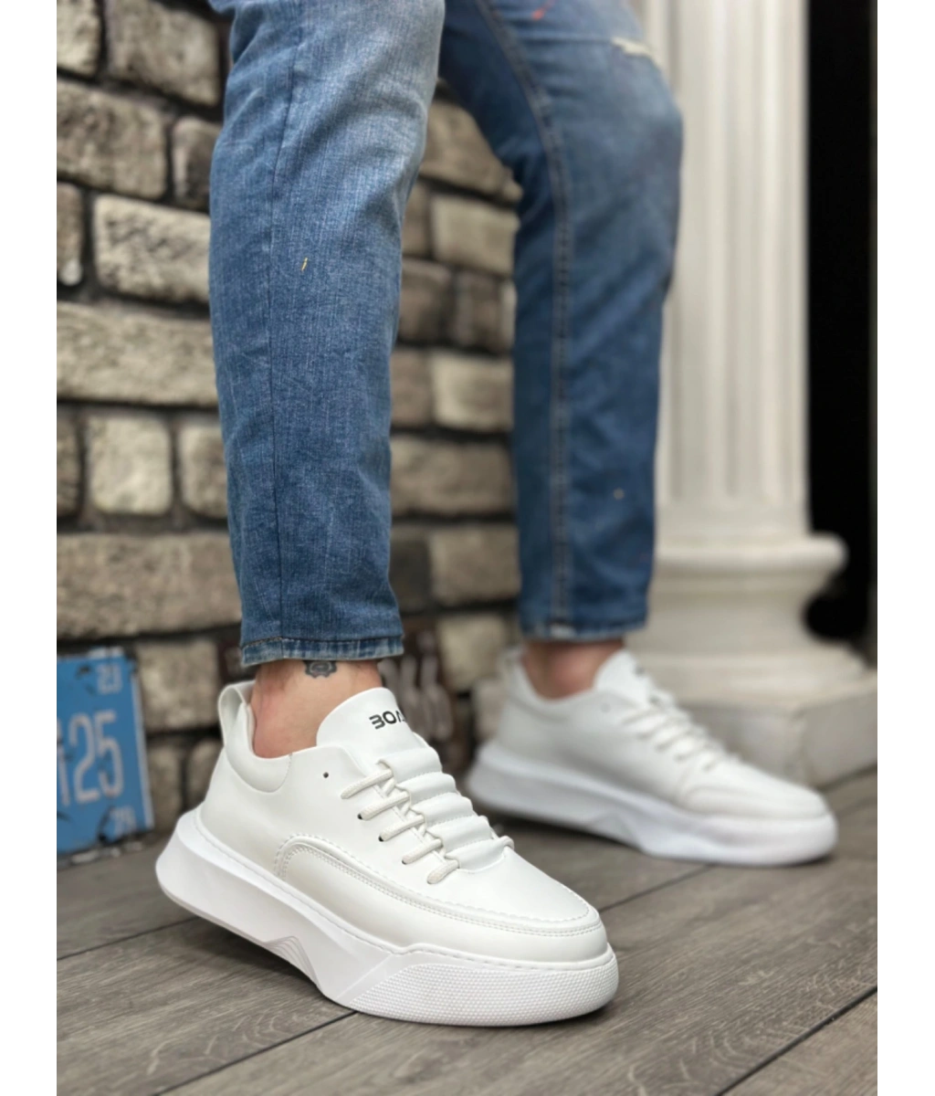 Shoecide Sb0332 Merdiven Desen Bağcıklı Erkek Yüksek Taban Beyaz Cilt Spor Ayakkabı