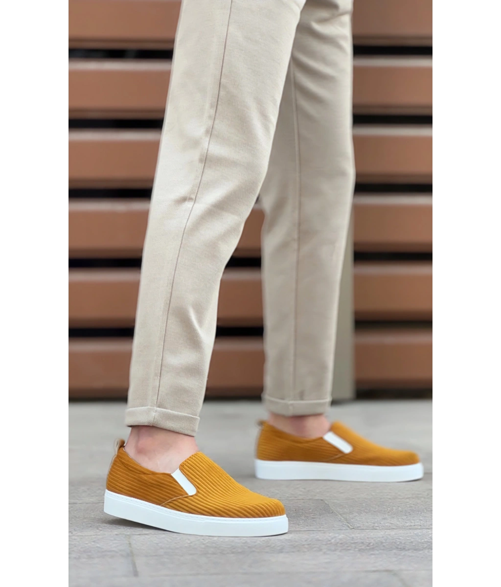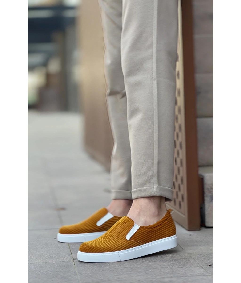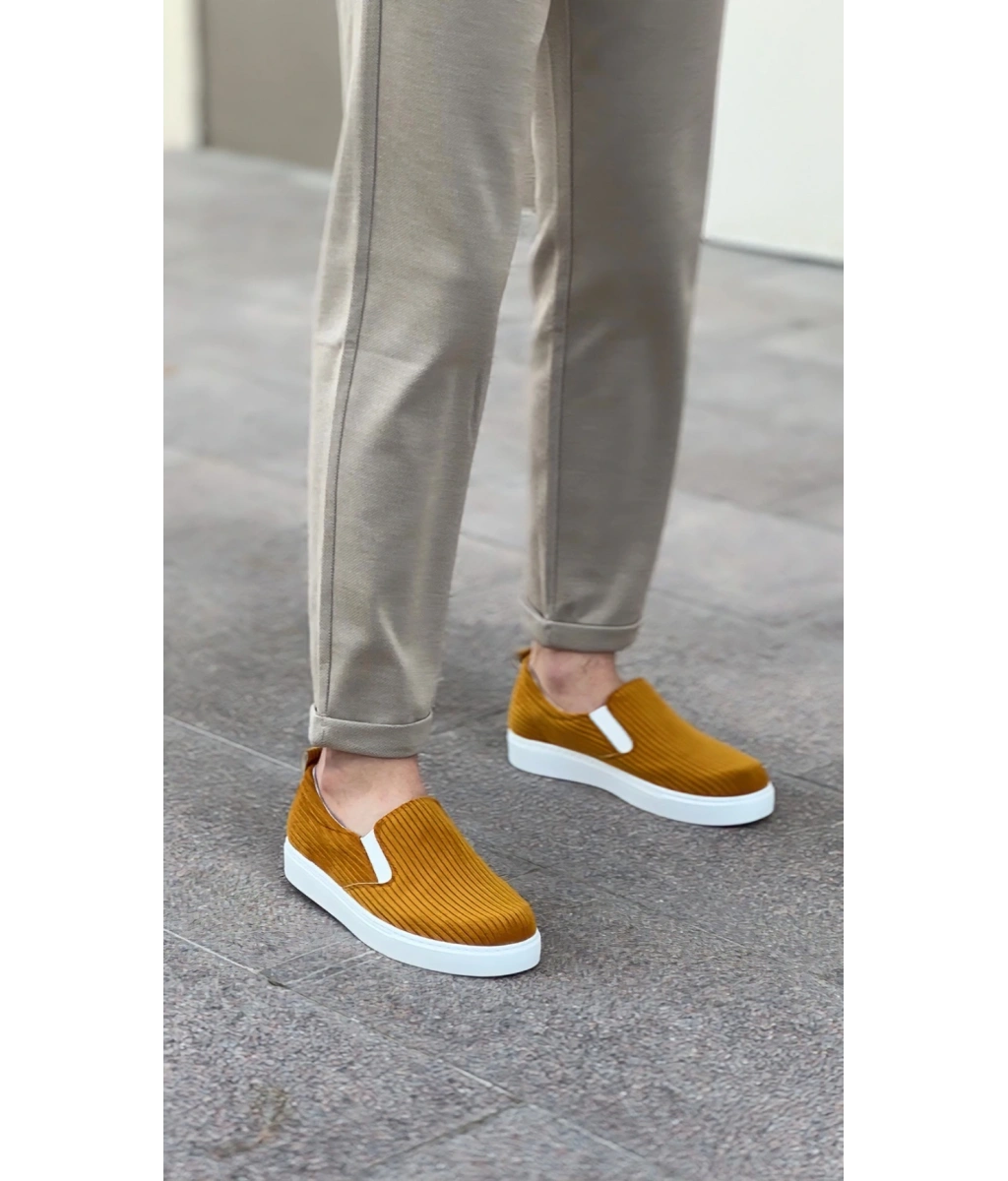 Shoecide Sb0339 Bağcıksız Kadife Hardal Beyaz Taban Günlük Erkek Ayakkabı