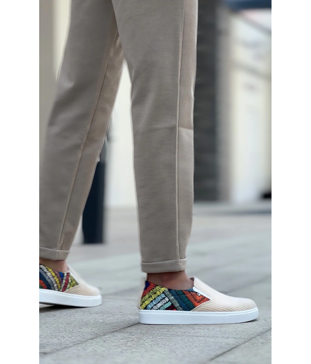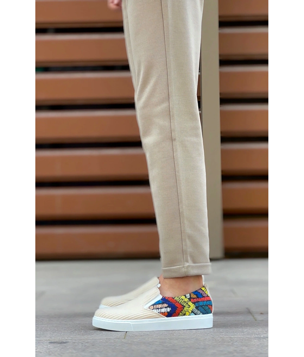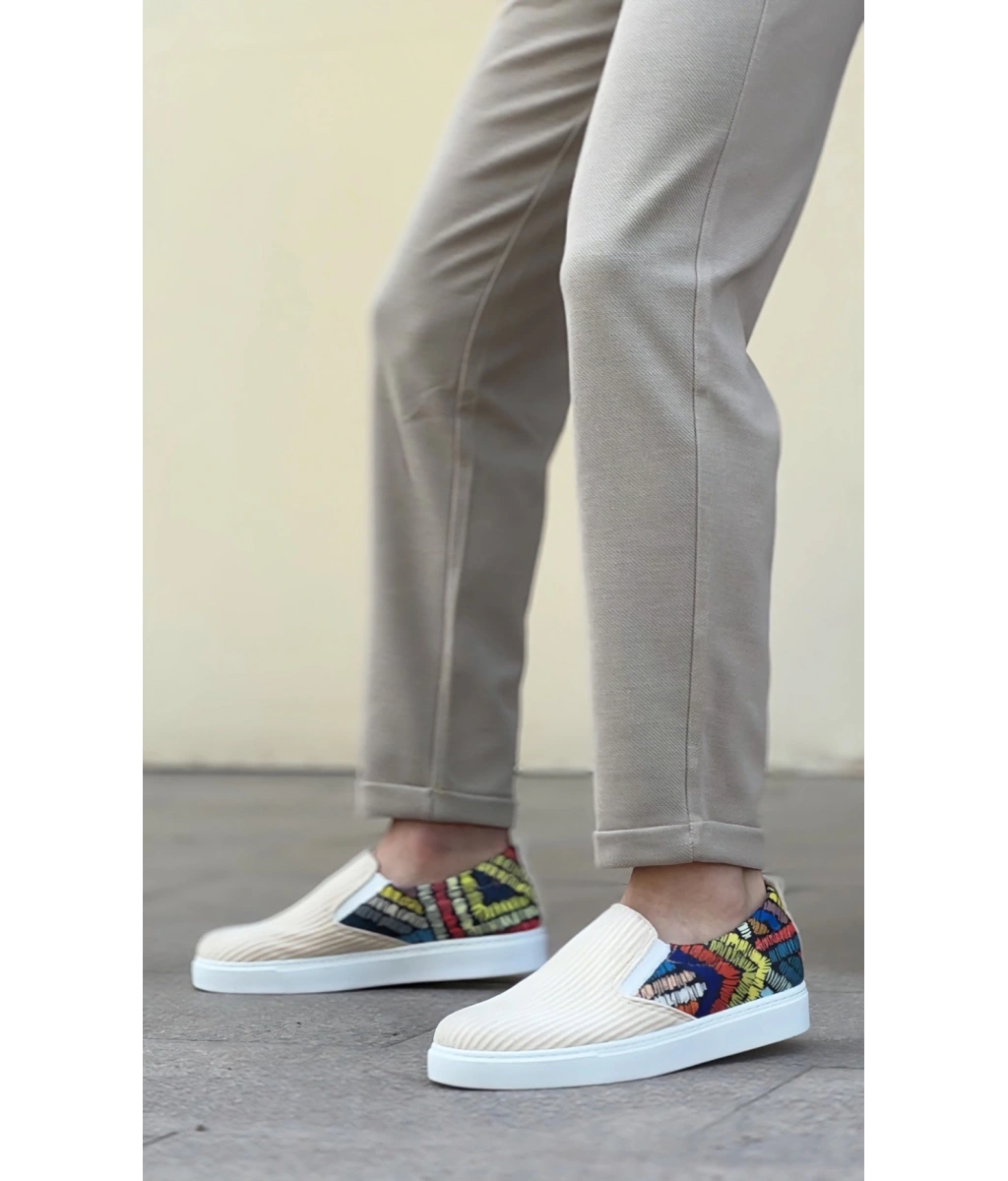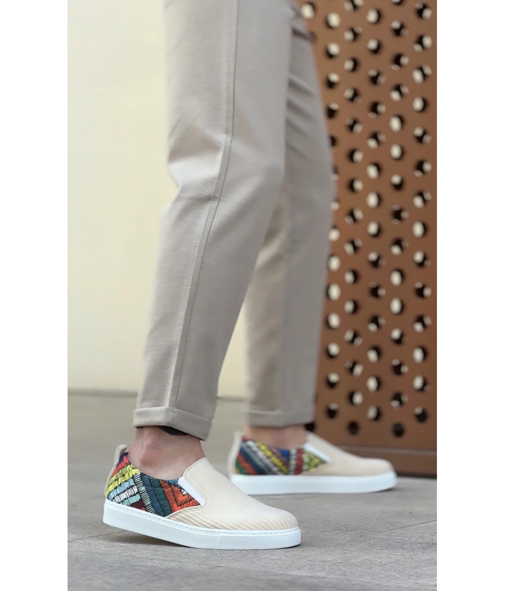 Shoecide Sb0339 Bağcıksız Keten Krem Renkli Desenli Beyaz Taban Günlük Erkek Ayakkabı
