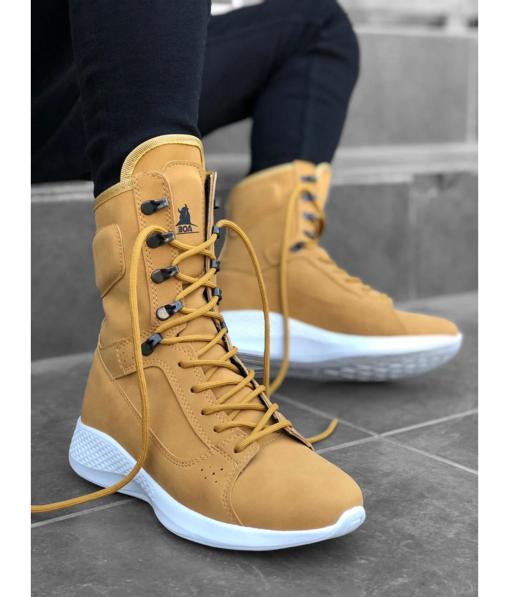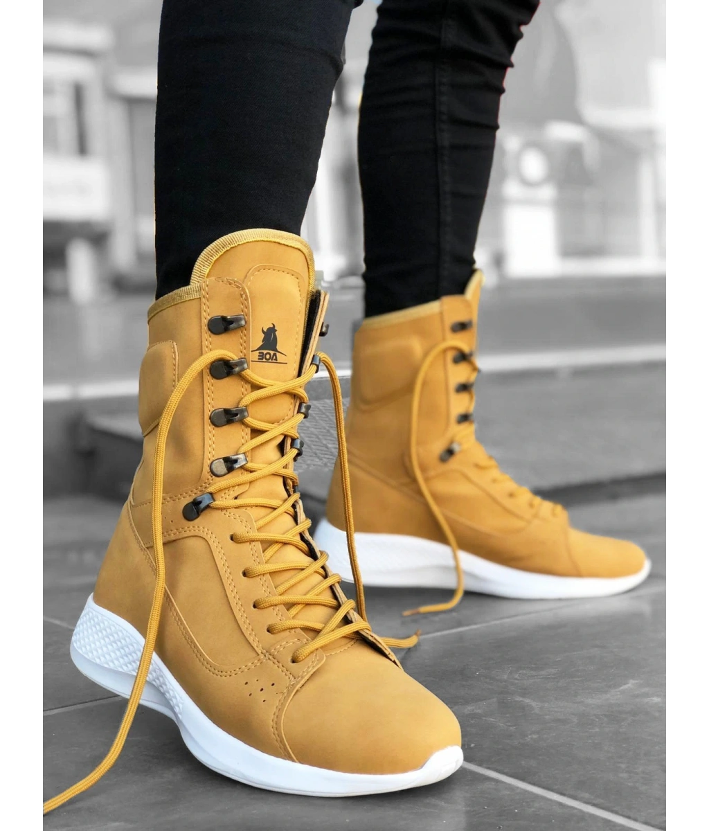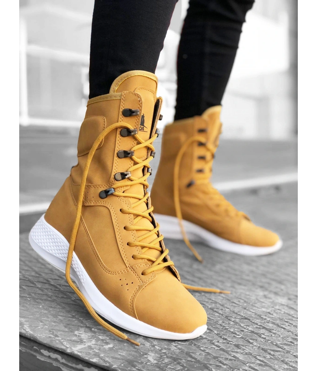 Shoecide Sb0713 Bağcıklı Sarı Yüksek Taban Erkek Tarz Spor Bot