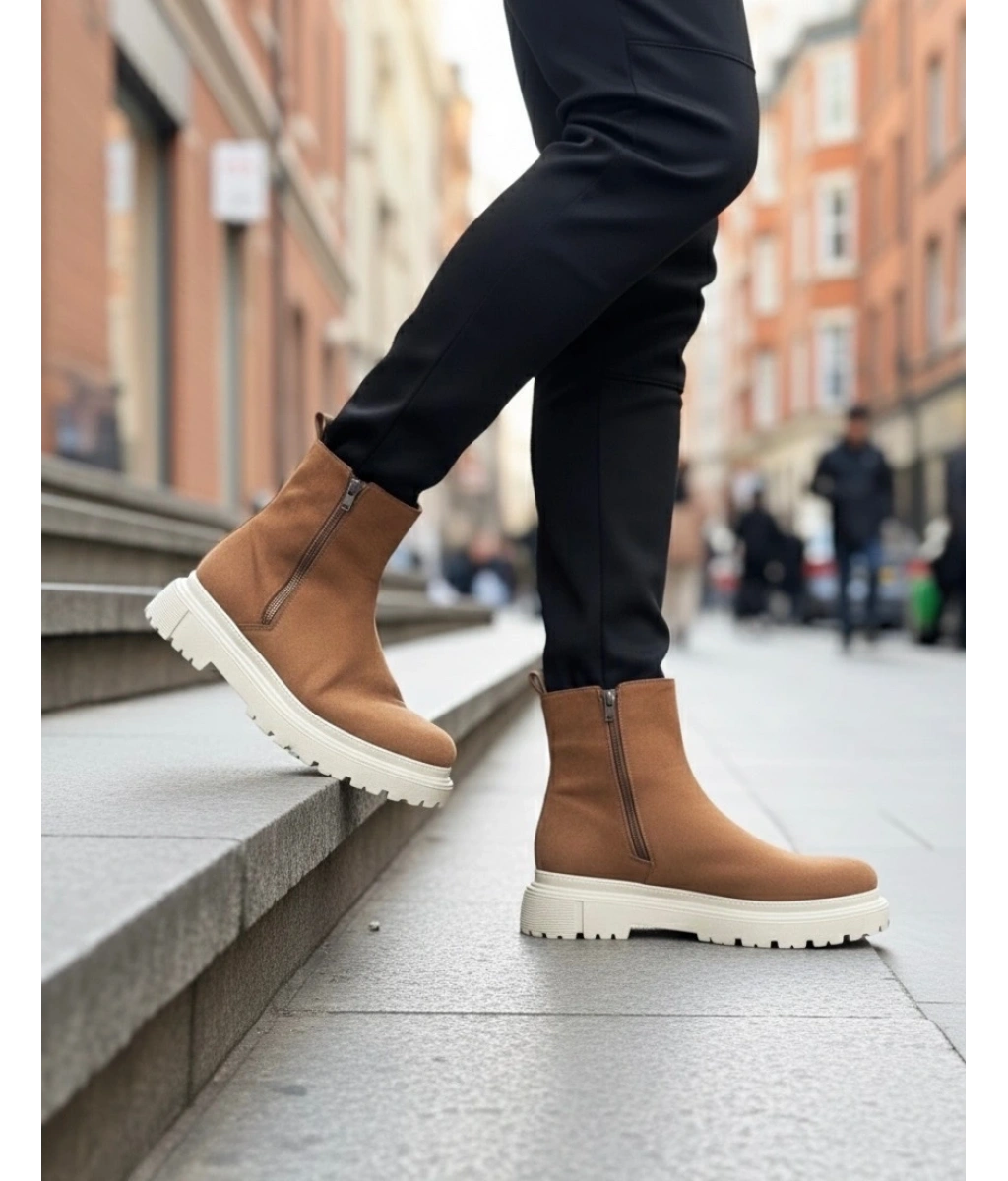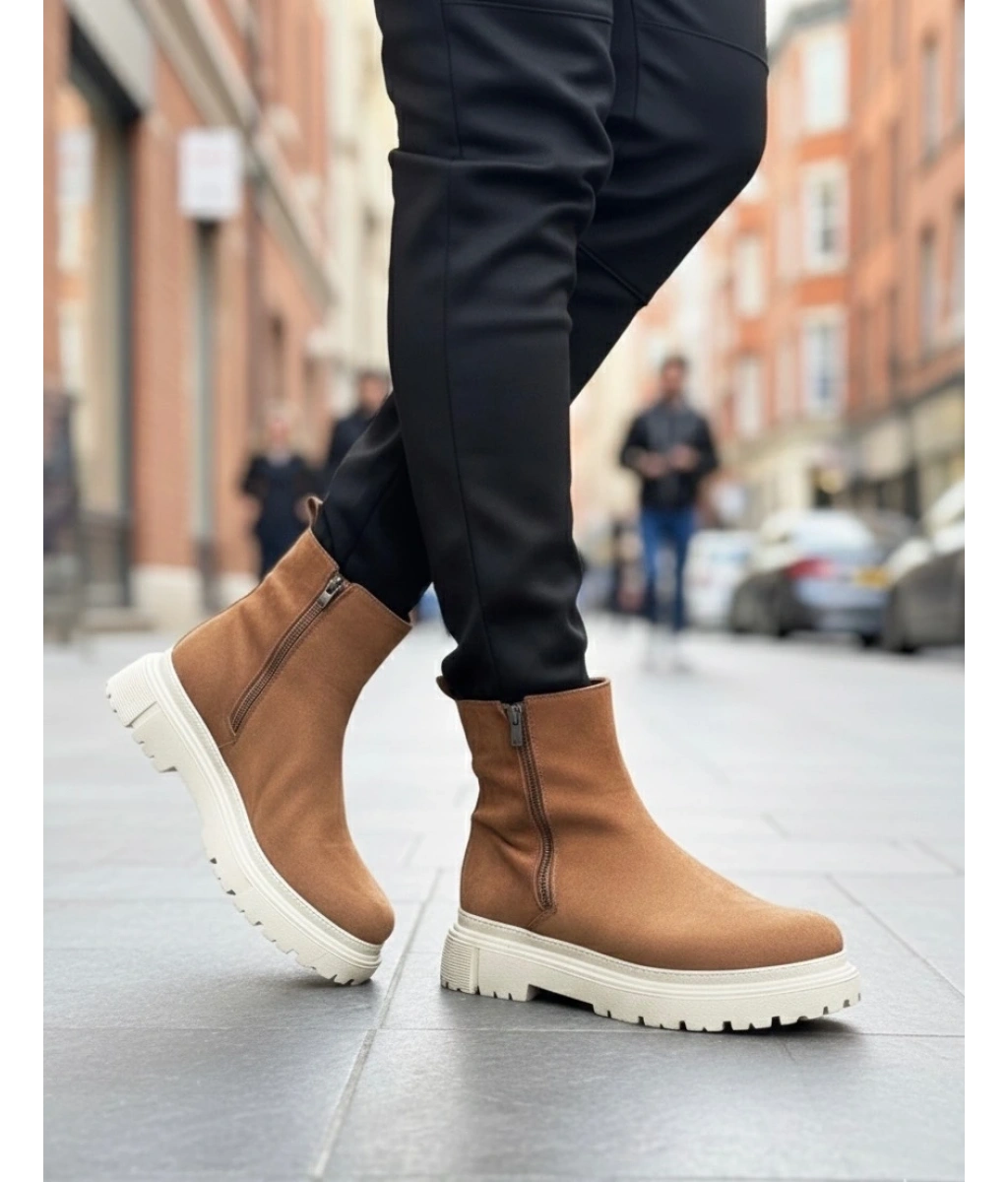 Shoecide Sb0777 Süet Taba Krem Taban Çift Fermuarlı Erkek Yarım Bilek Bot