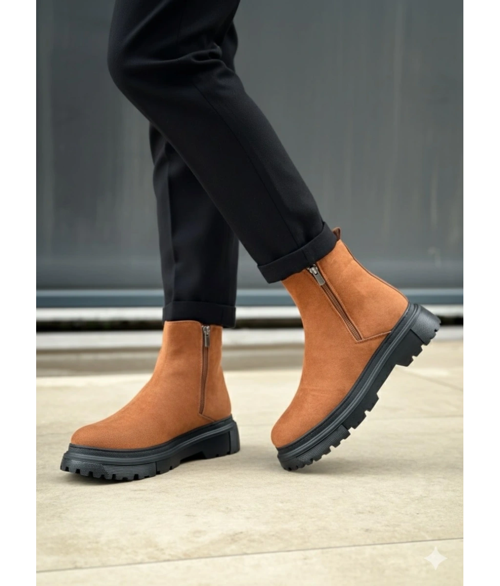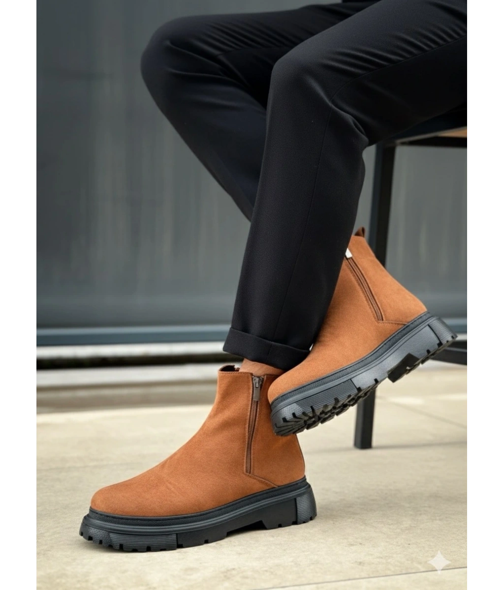 Shoecide Sb0777 Süet Taba Siyah Taban Çift Fermuarlı Erkek Yarım Bilek Bot