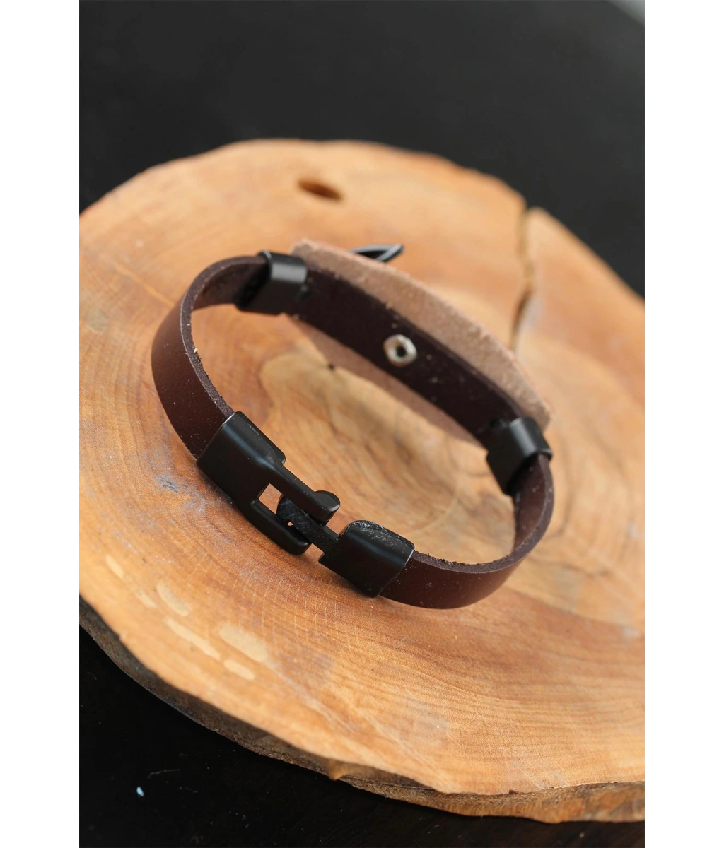 Shoecide Siyah Deniz Çapalı Çelik Aksesuarlı Kahverengi Deri Erkek Bileklik