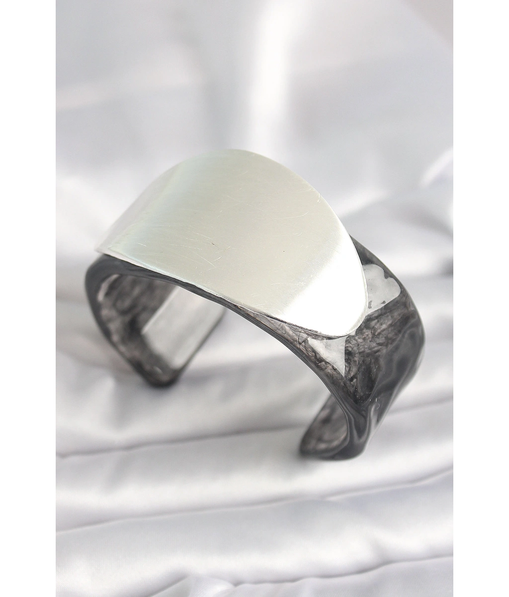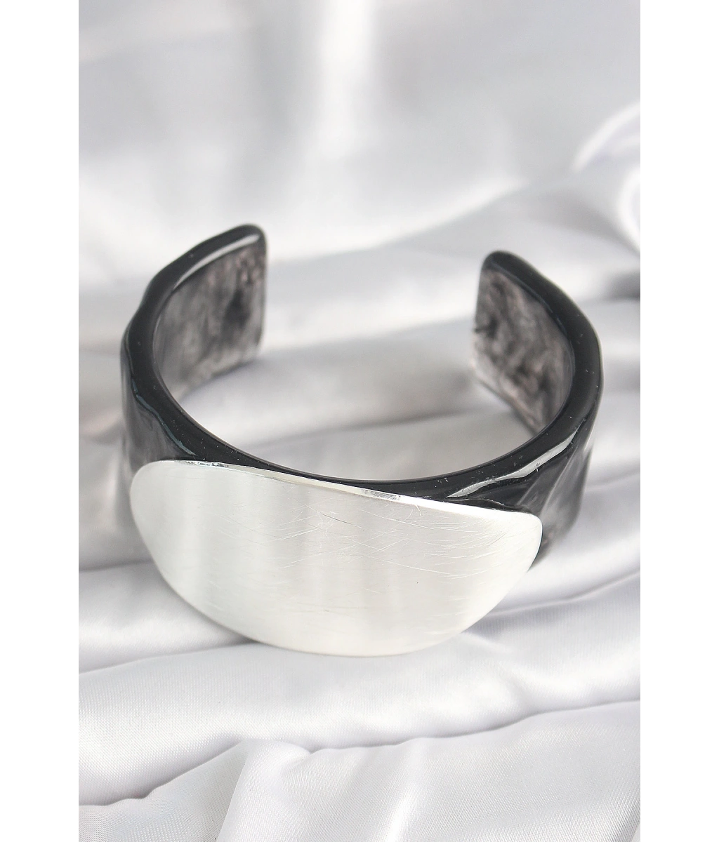 Shoecide Siyah Mermer Desen Akrilik Plastik Gümüş Oval Plaka Model Vintage Kadın Bilezik