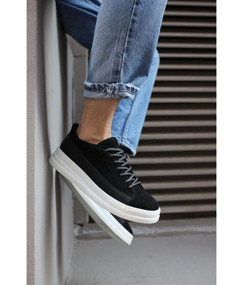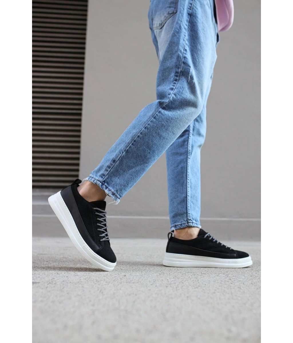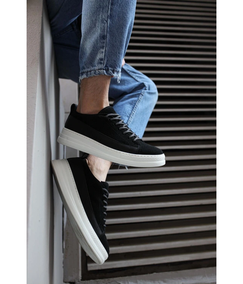 Shoecide Sb0332 Merdiven Desen Bağcıklı Erkek Yüksek Taban Siyah Cilt Beyaz Taban Spor Ayakkabı
