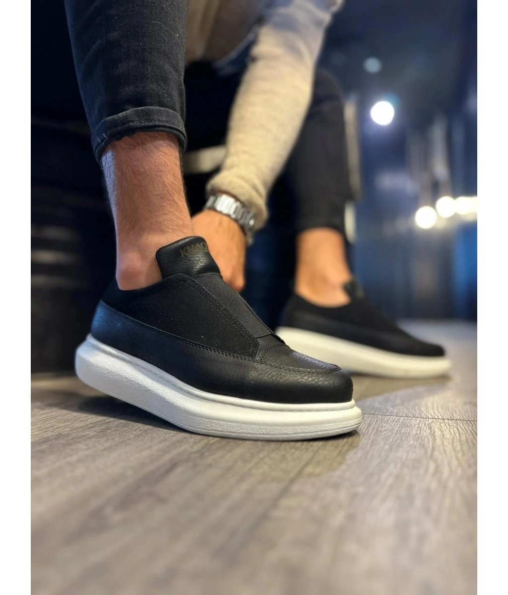 Shoecide Sb0332 Merdiven Desen Bağcıklı Erkek Yüksek Taban Siyah Cilt Beyaz Taban Spor Ayakkabı