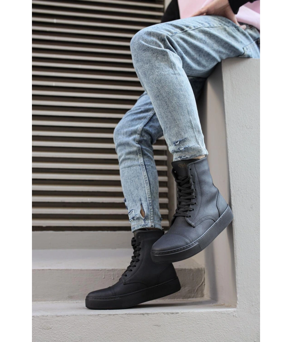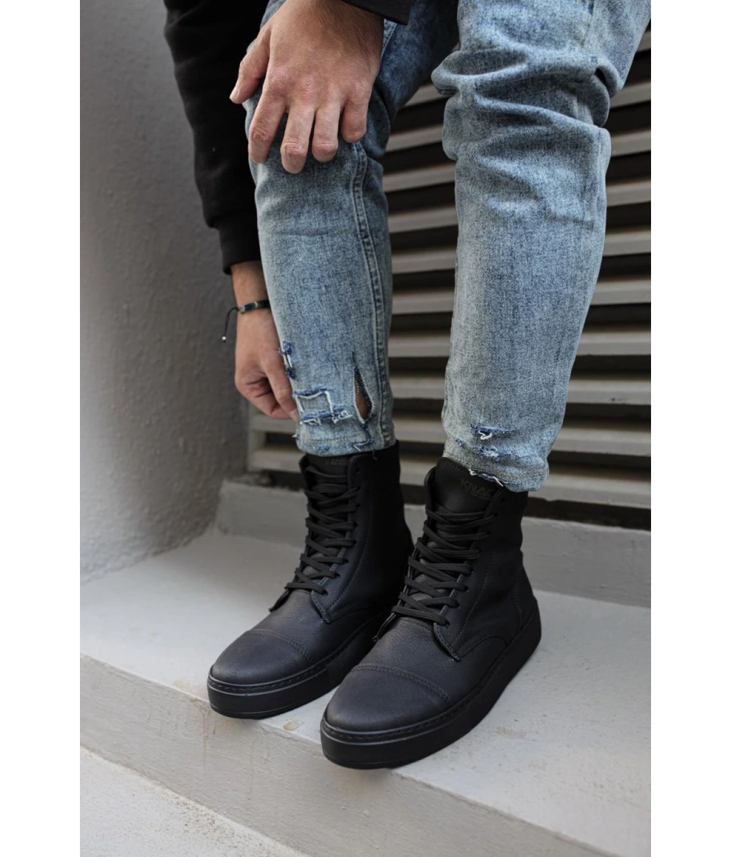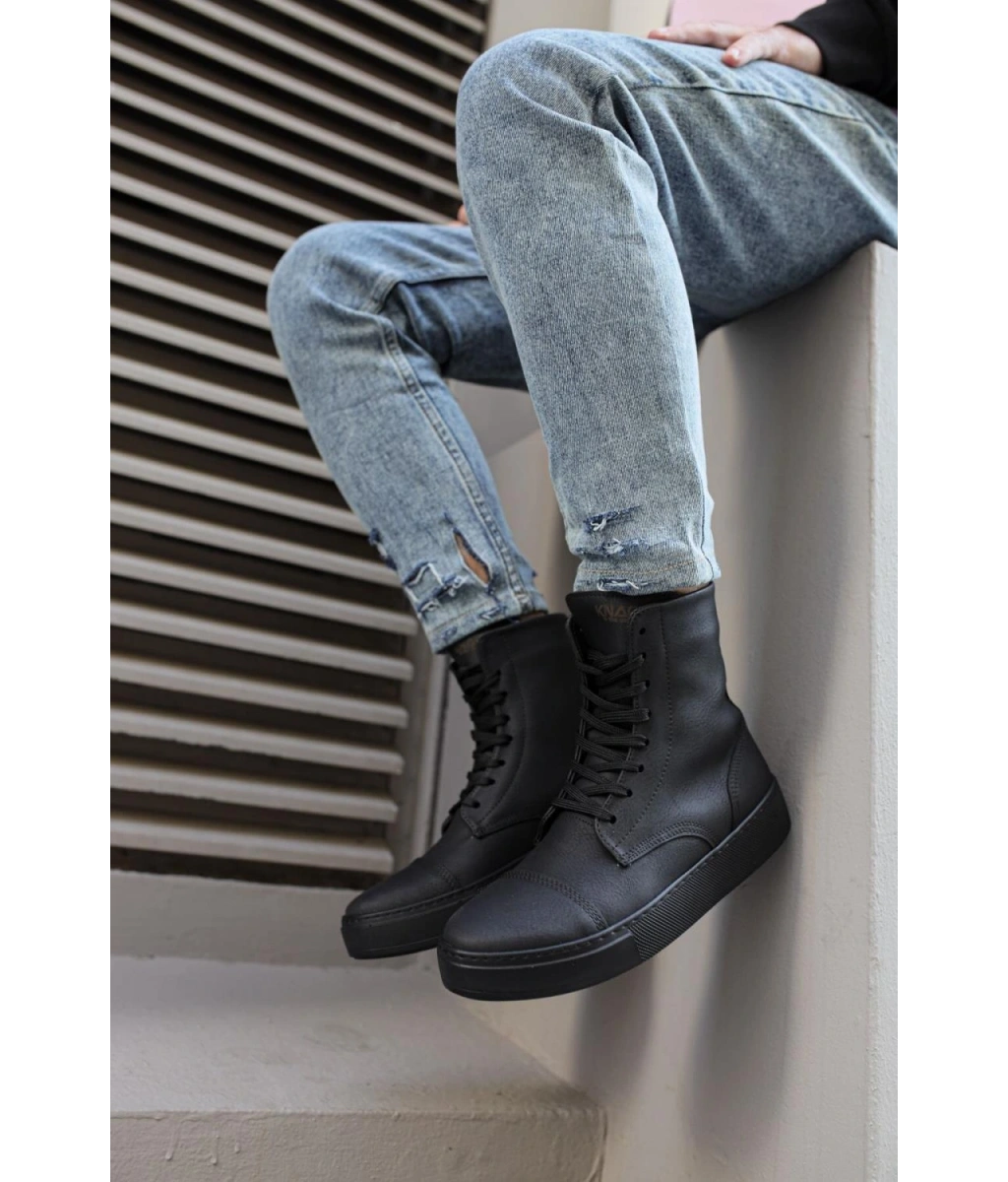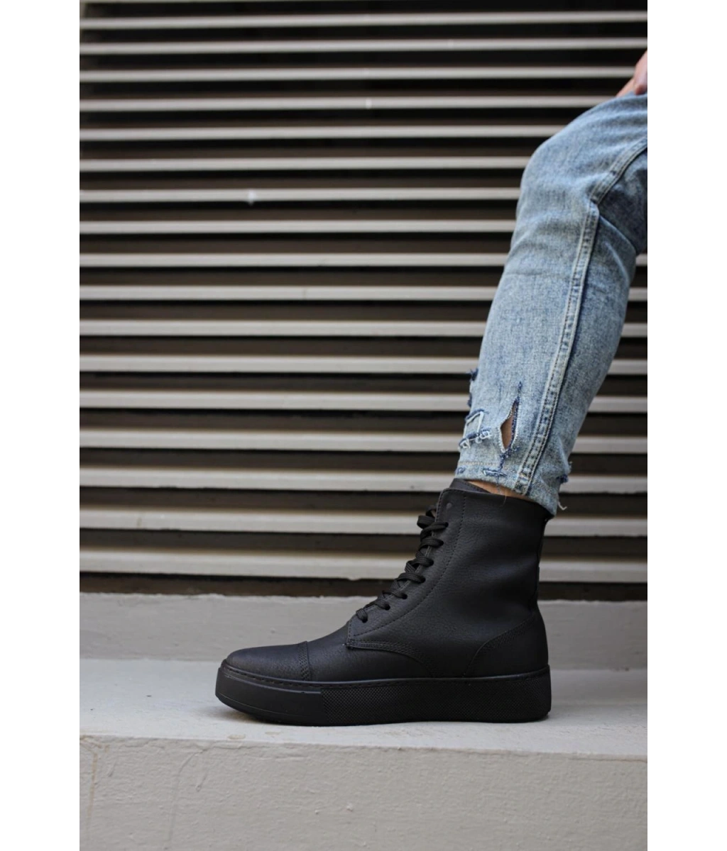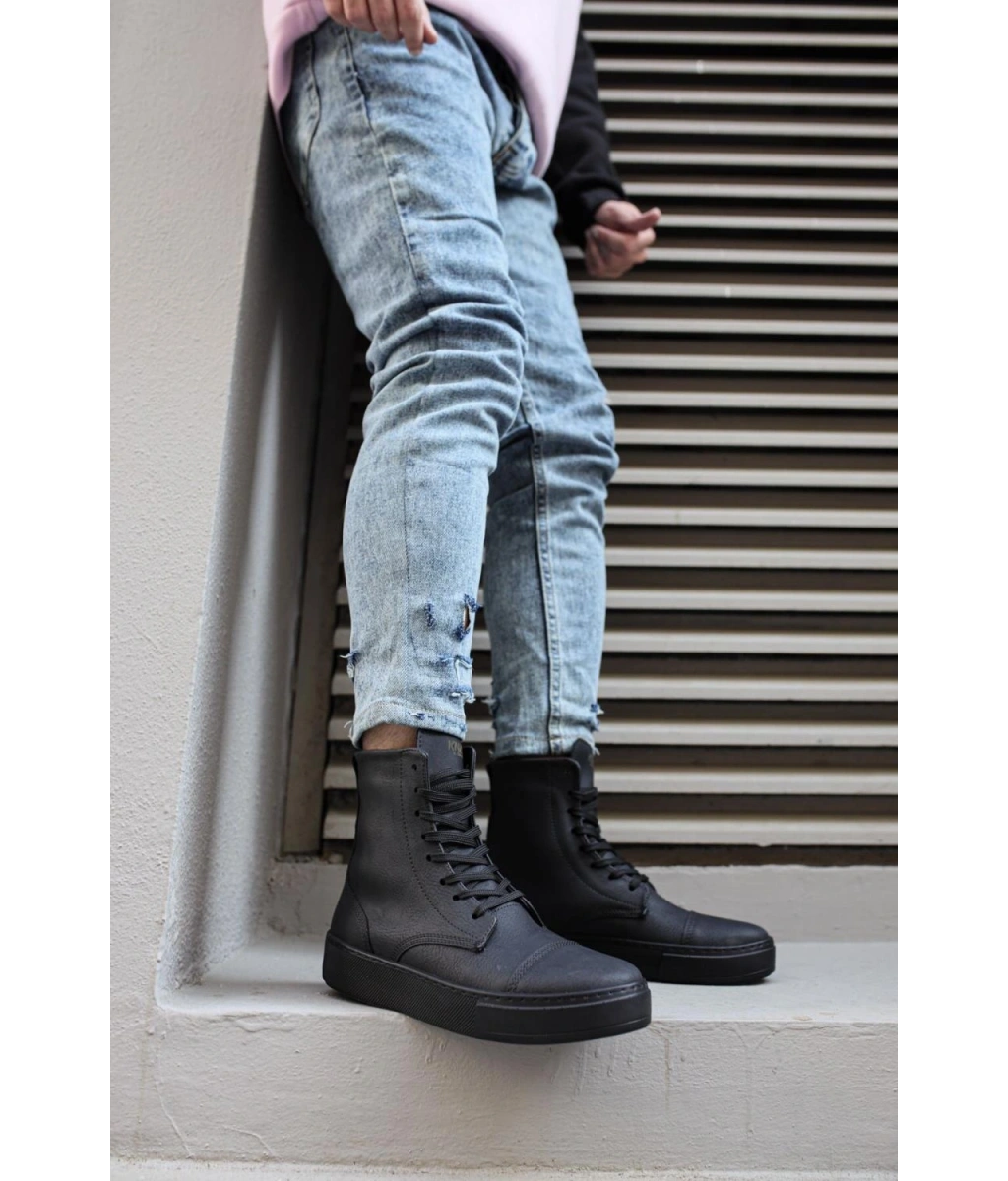 Shoecide Le10 Bağcıklı Erkek Yüksek Siyah Taban Siyah Spor Bot