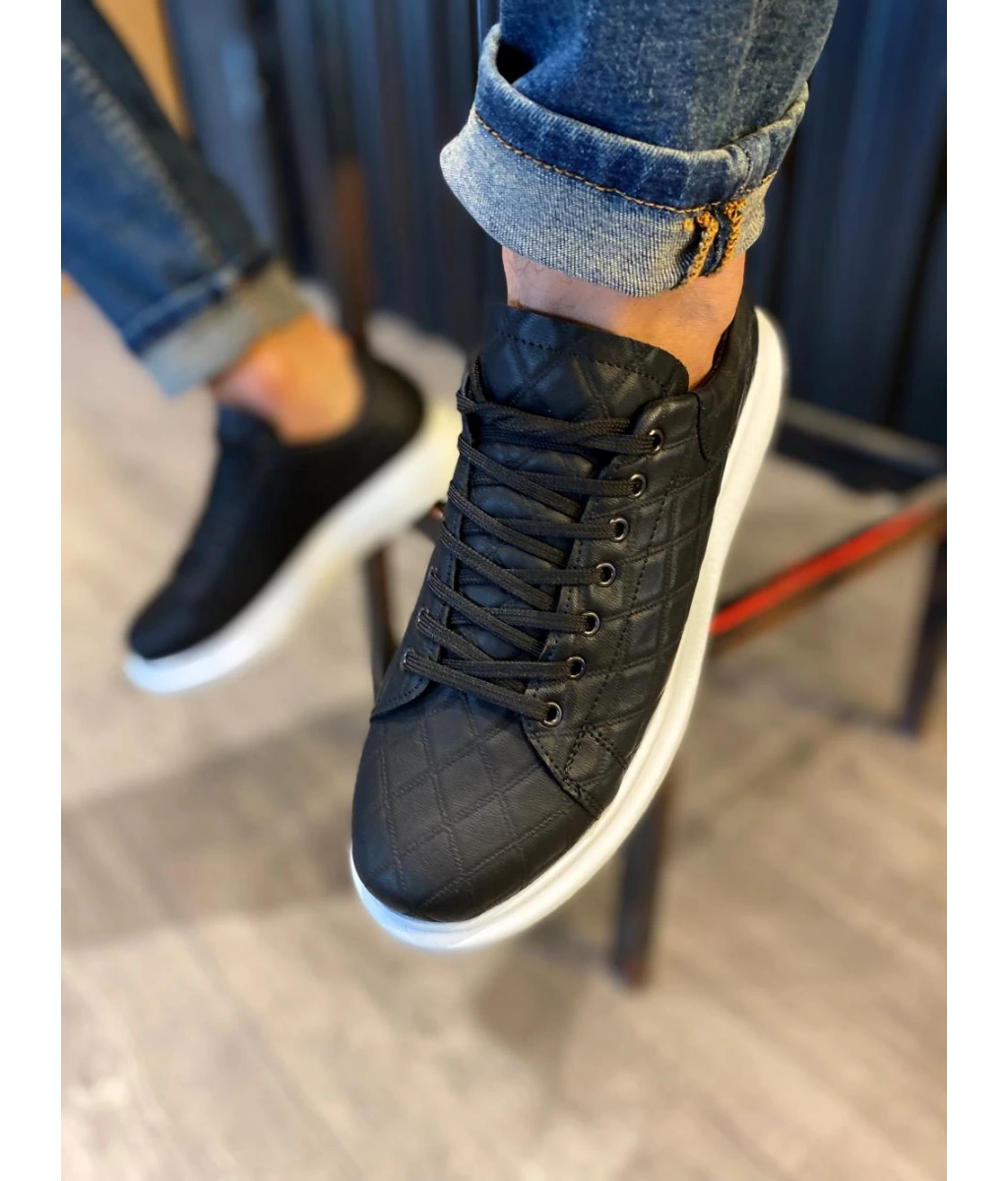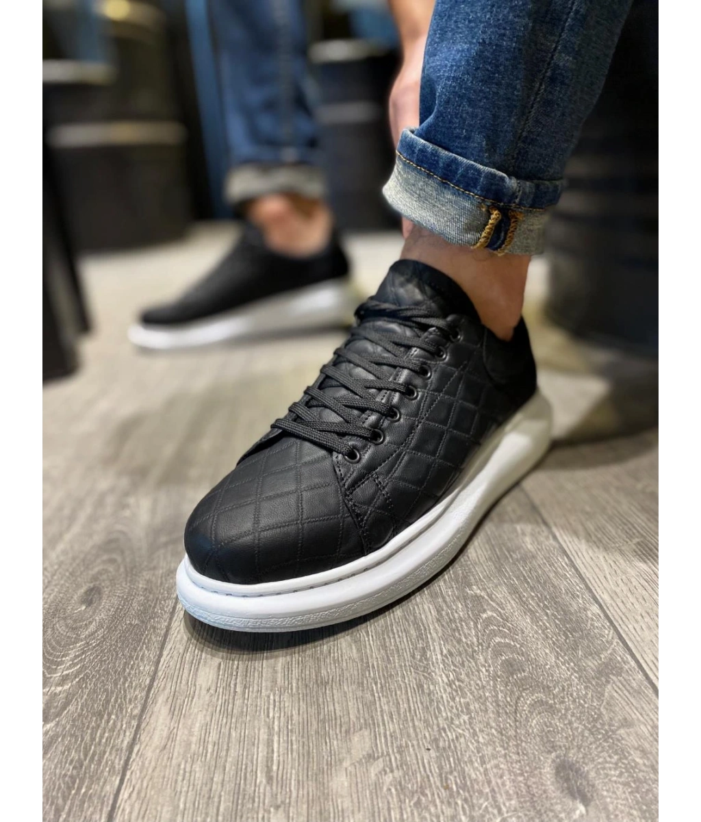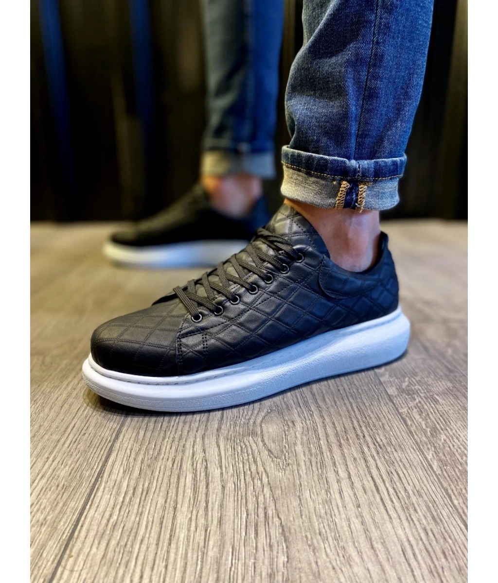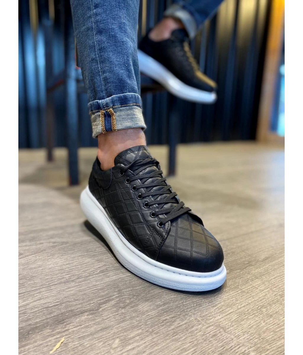 Shoecide Sb0332 Merdiven Desen Bağcıklı Erkek Yüksek Taban Siyah Cilt Beyaz Taban Spor Ayakkabı