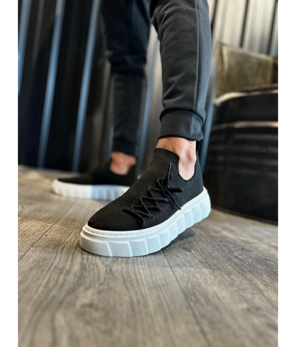 Shoecide Sb0332 Merdiven Desen Bağcıklı Erkek Yüksek Taban Siyah Cilt Beyaz Taban Spor Ayakkabı