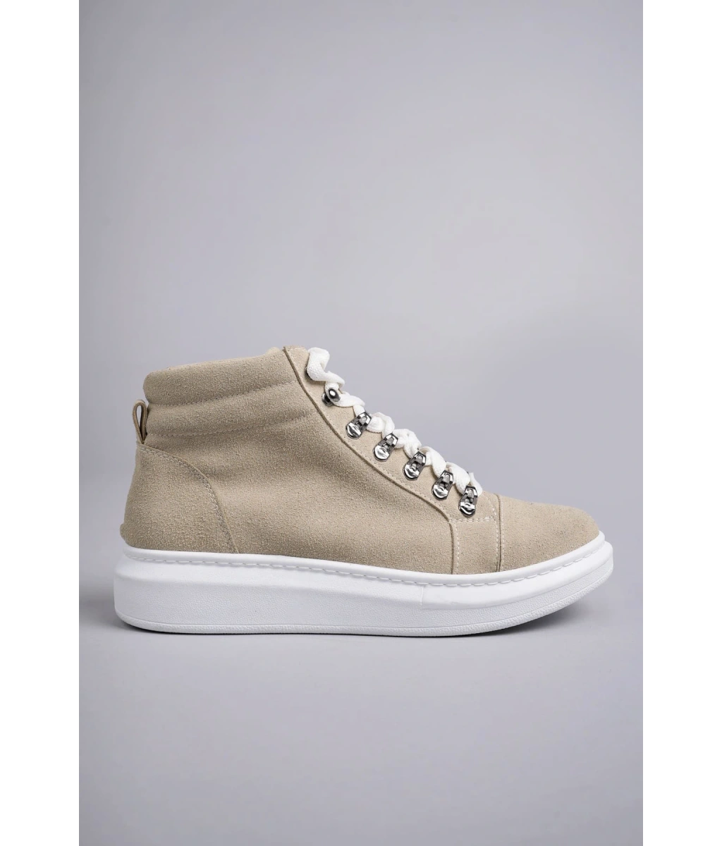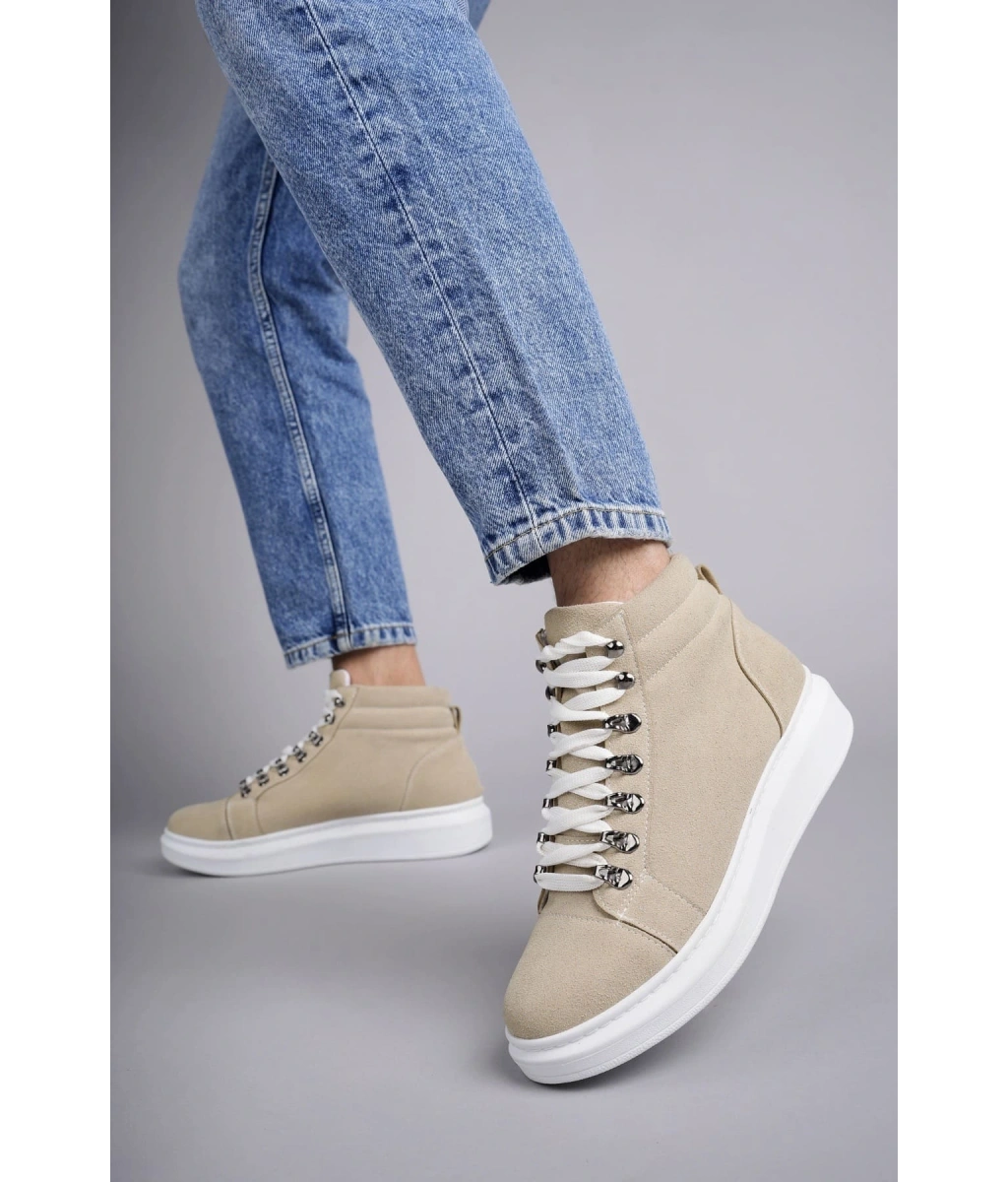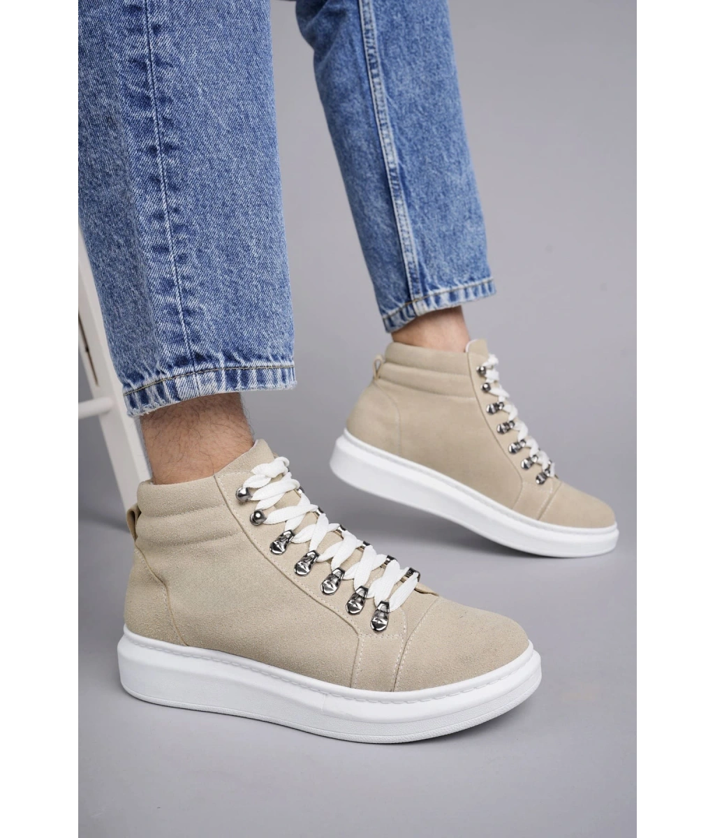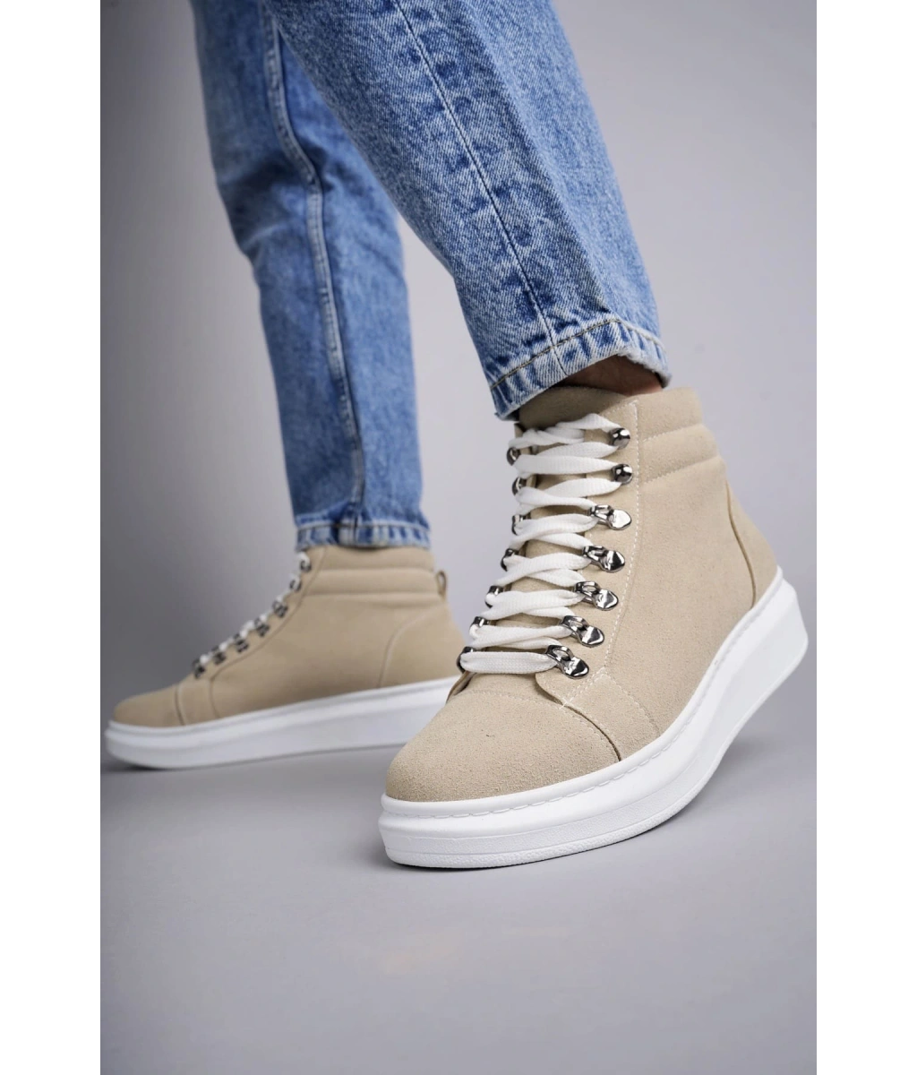 Shoecide Sb0713 Bağcıklı Süet Bej Yüksek Taban Erkek Tarz Spor Bot